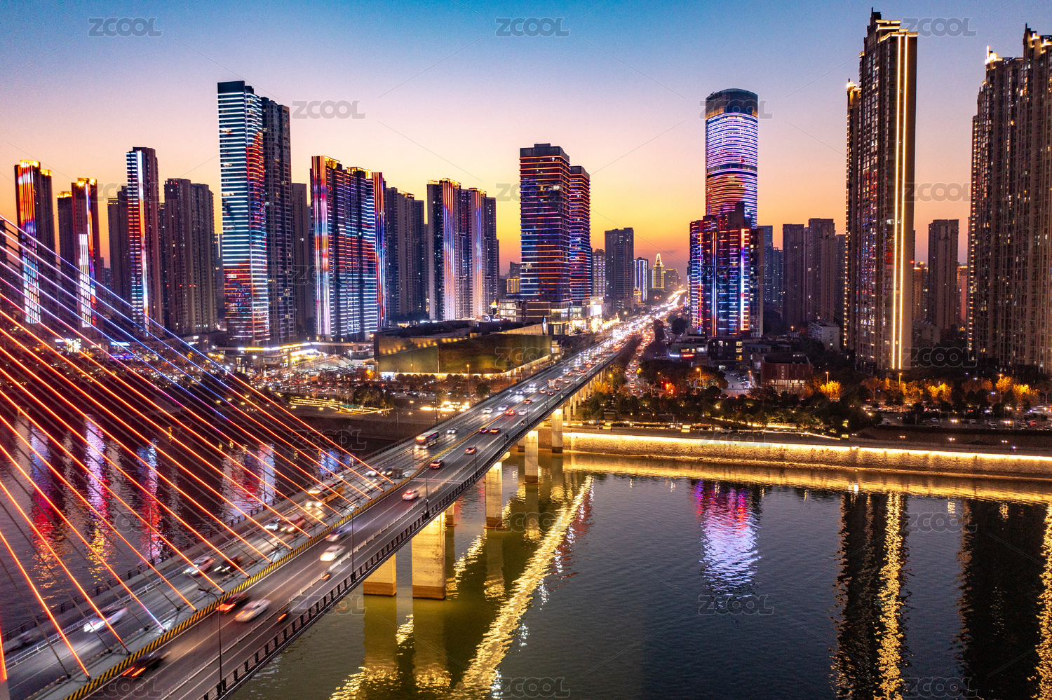 長沙銀盆嶺大橋與湘江東岸傍晚夜景