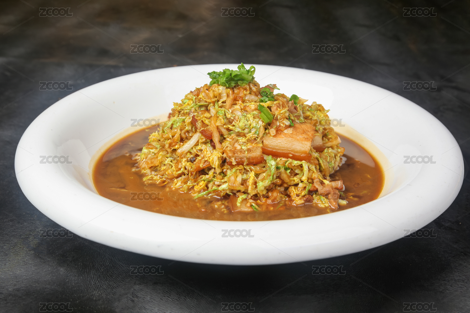 精美餐具裝的鐵板辣白菜炒五花肉配炸饅頭片