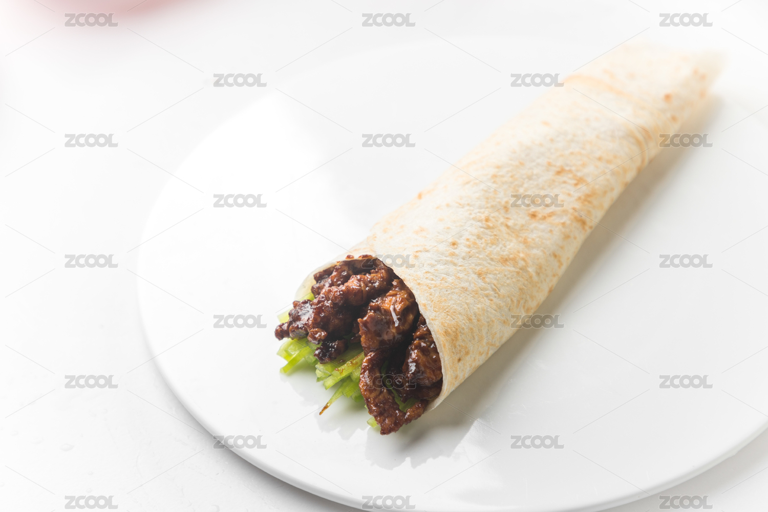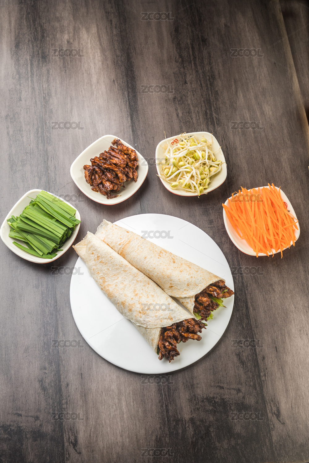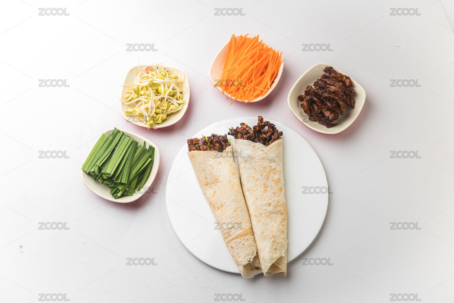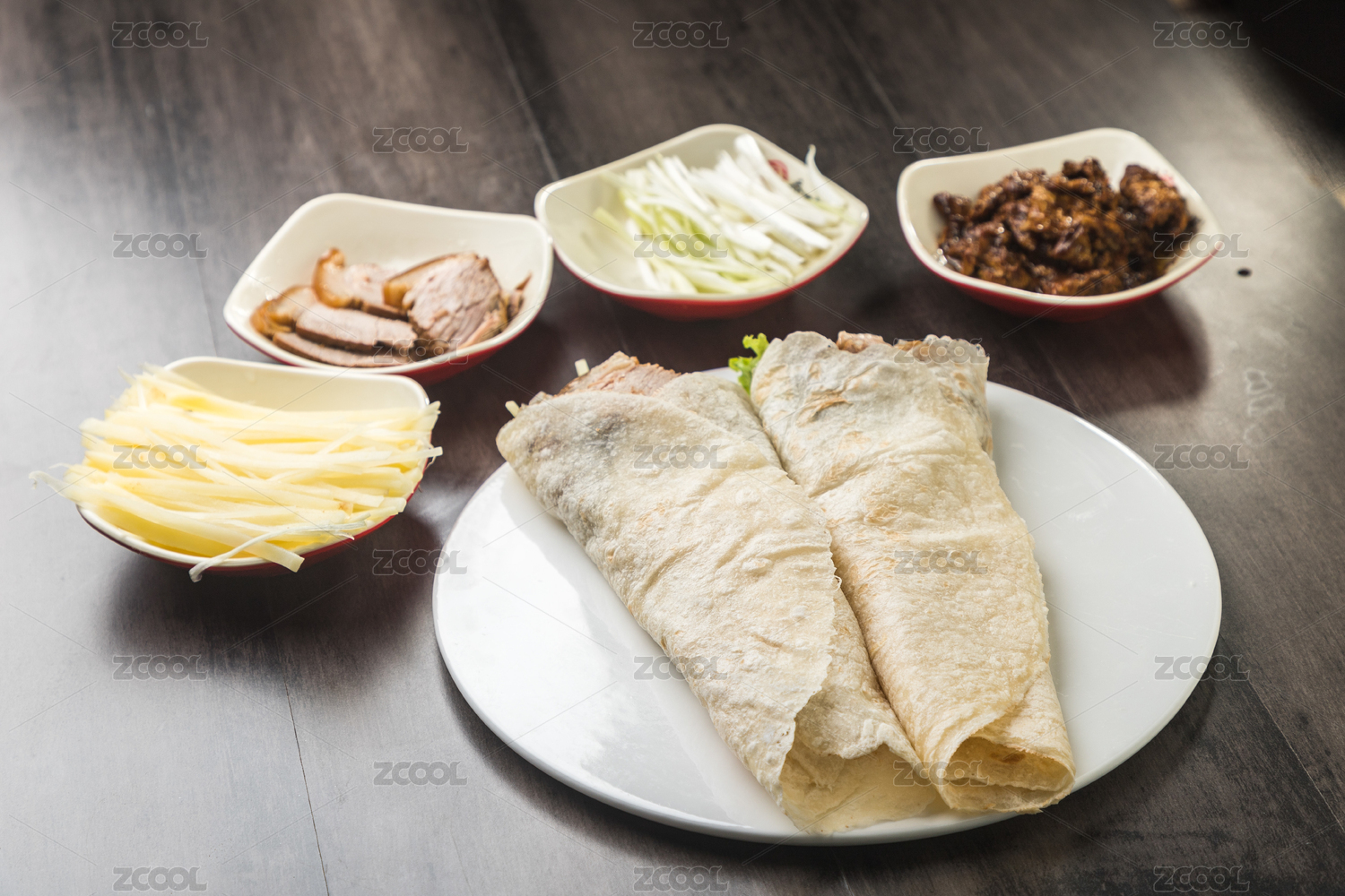 白色桌面上放著一些京醬肉絲卷餅和小菜