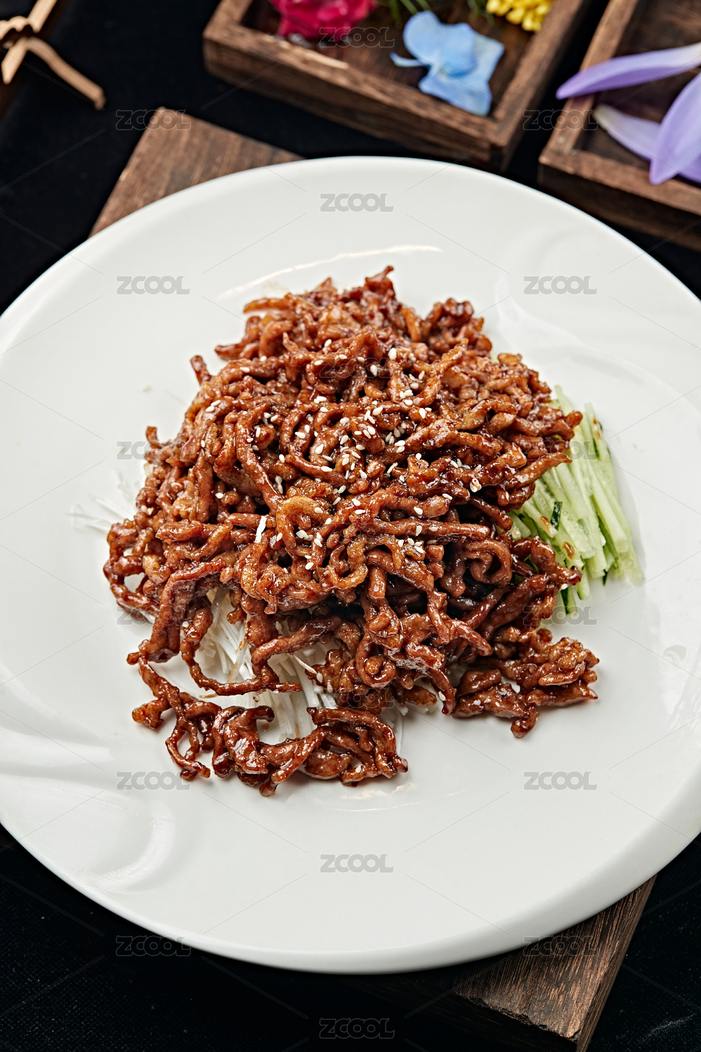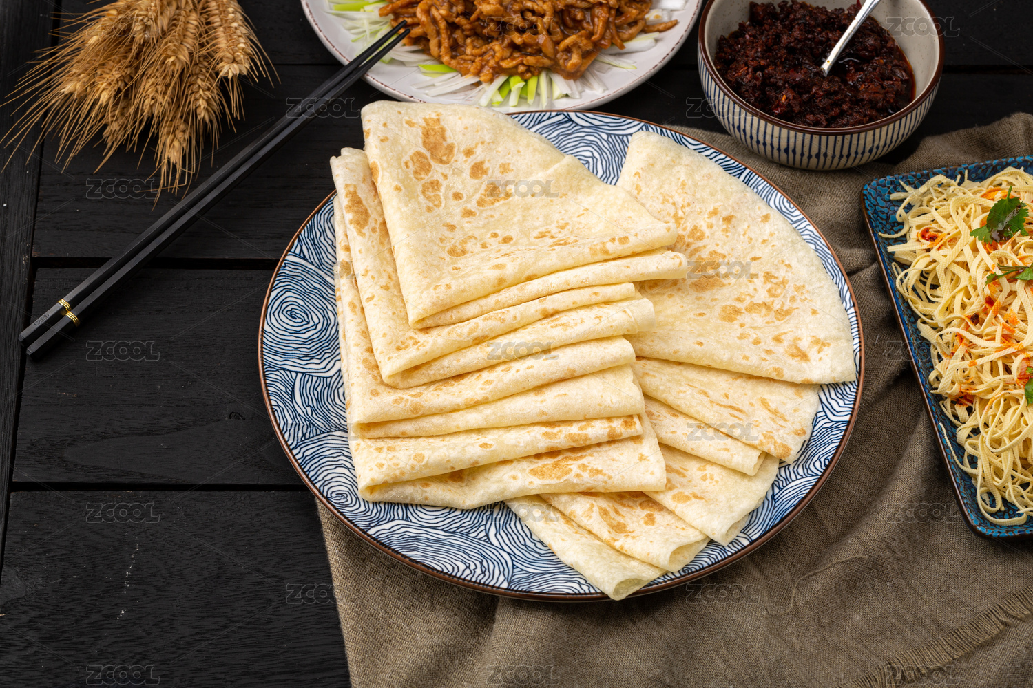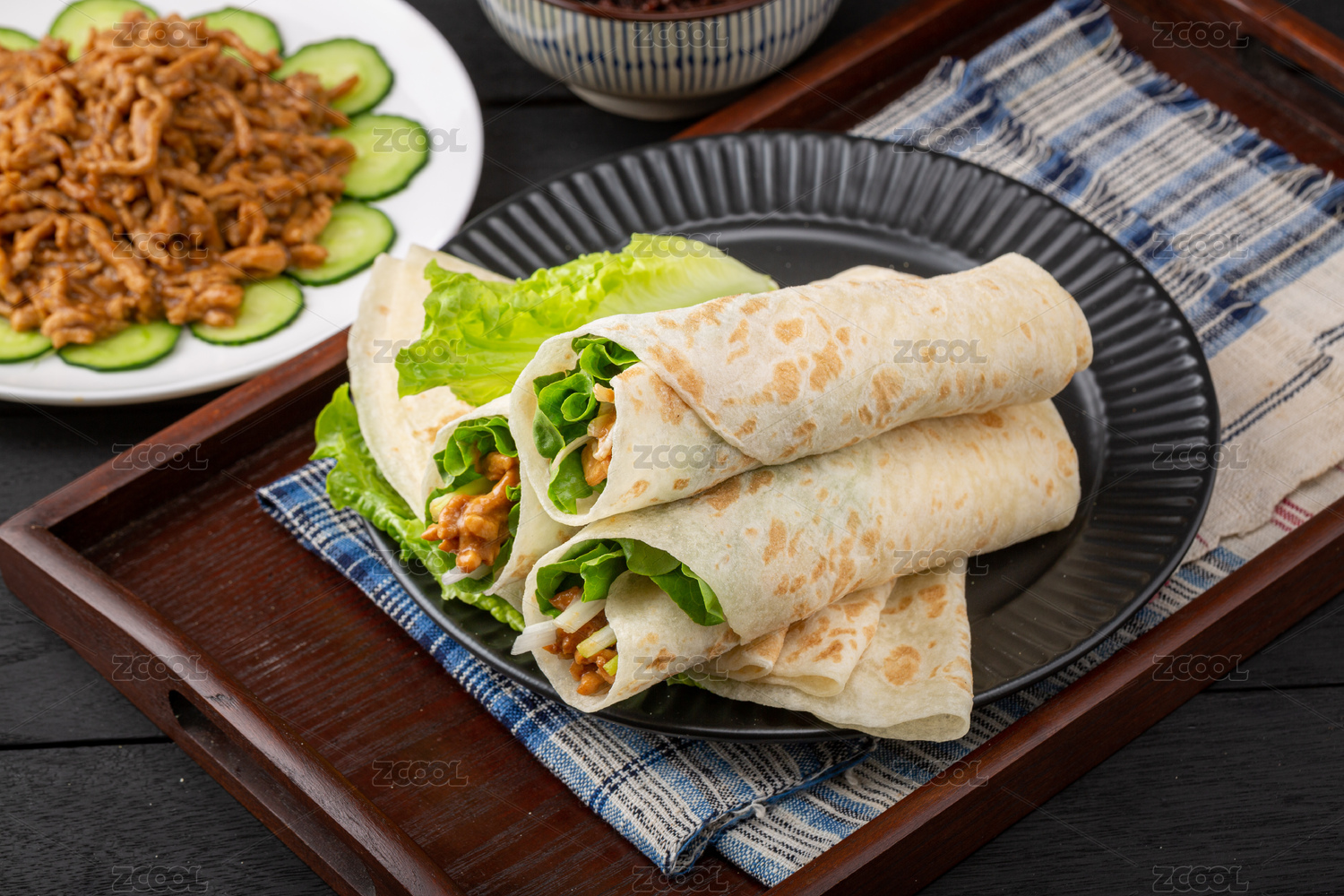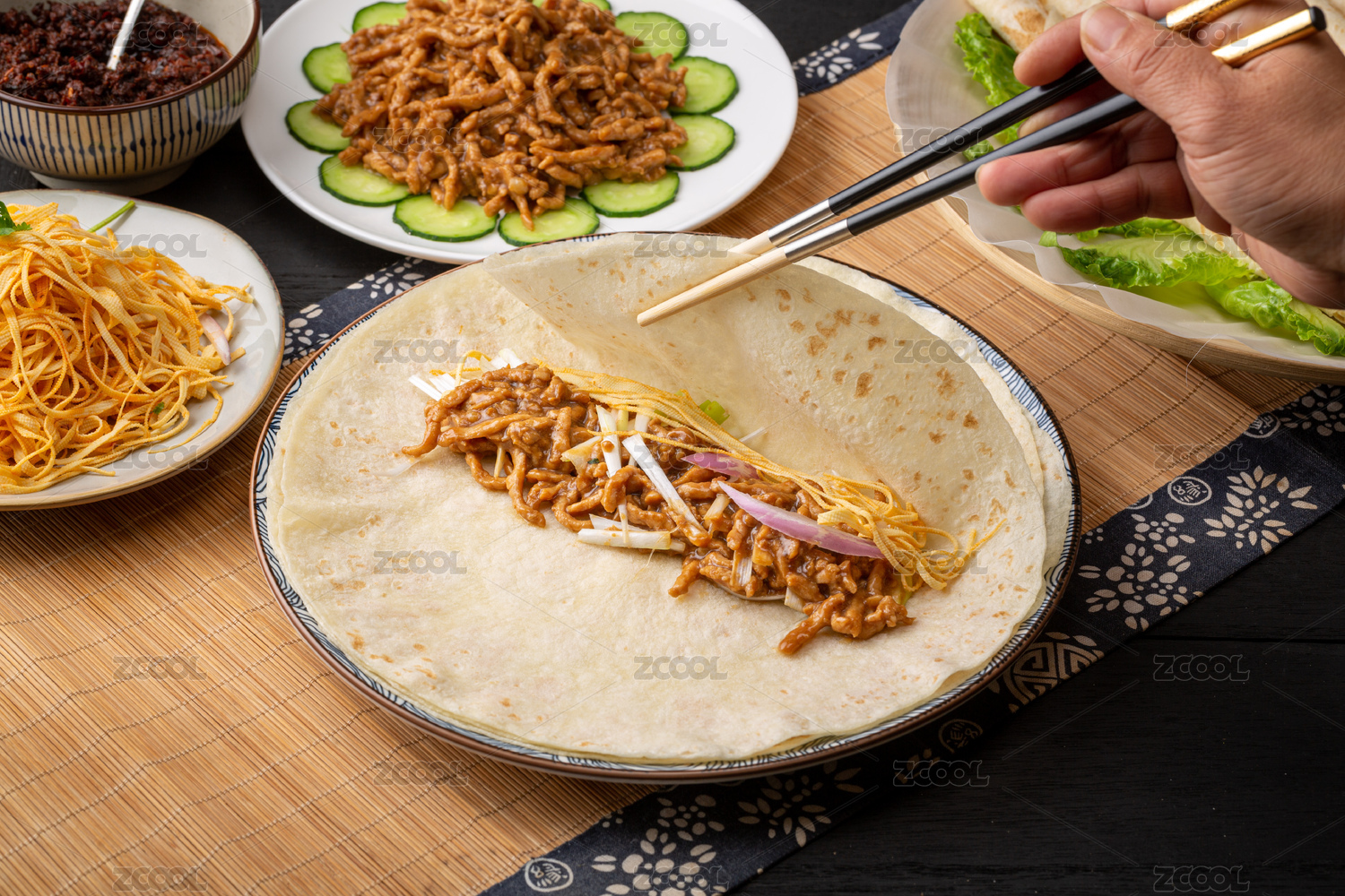 暗色木紋桌面上放著一些京醬肉絲卷餅和小菜