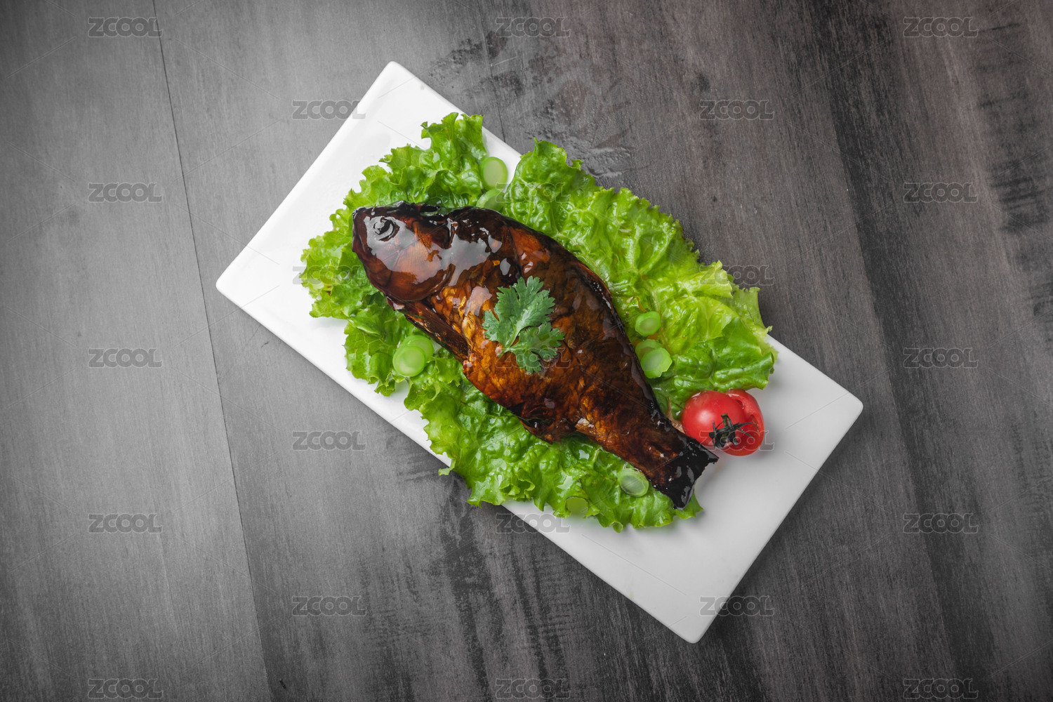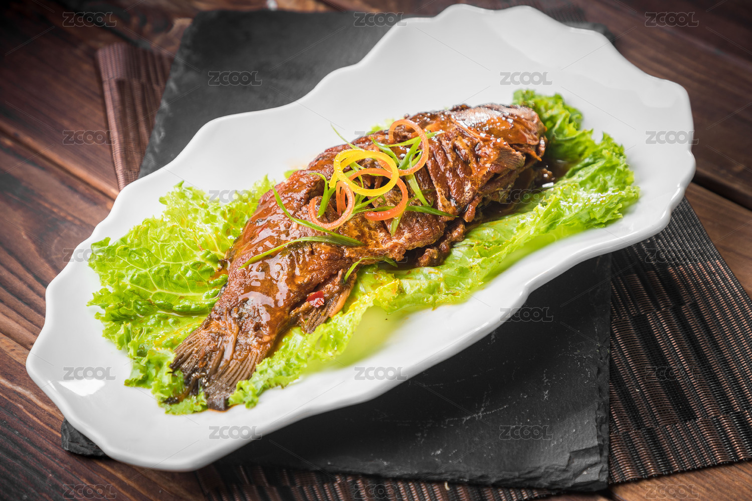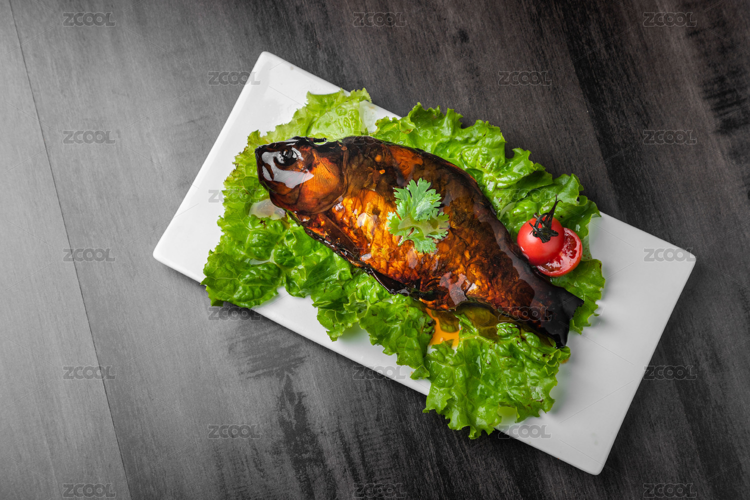棕色木紋桌面上放著一盤宮廷酥鯽魚(yú)