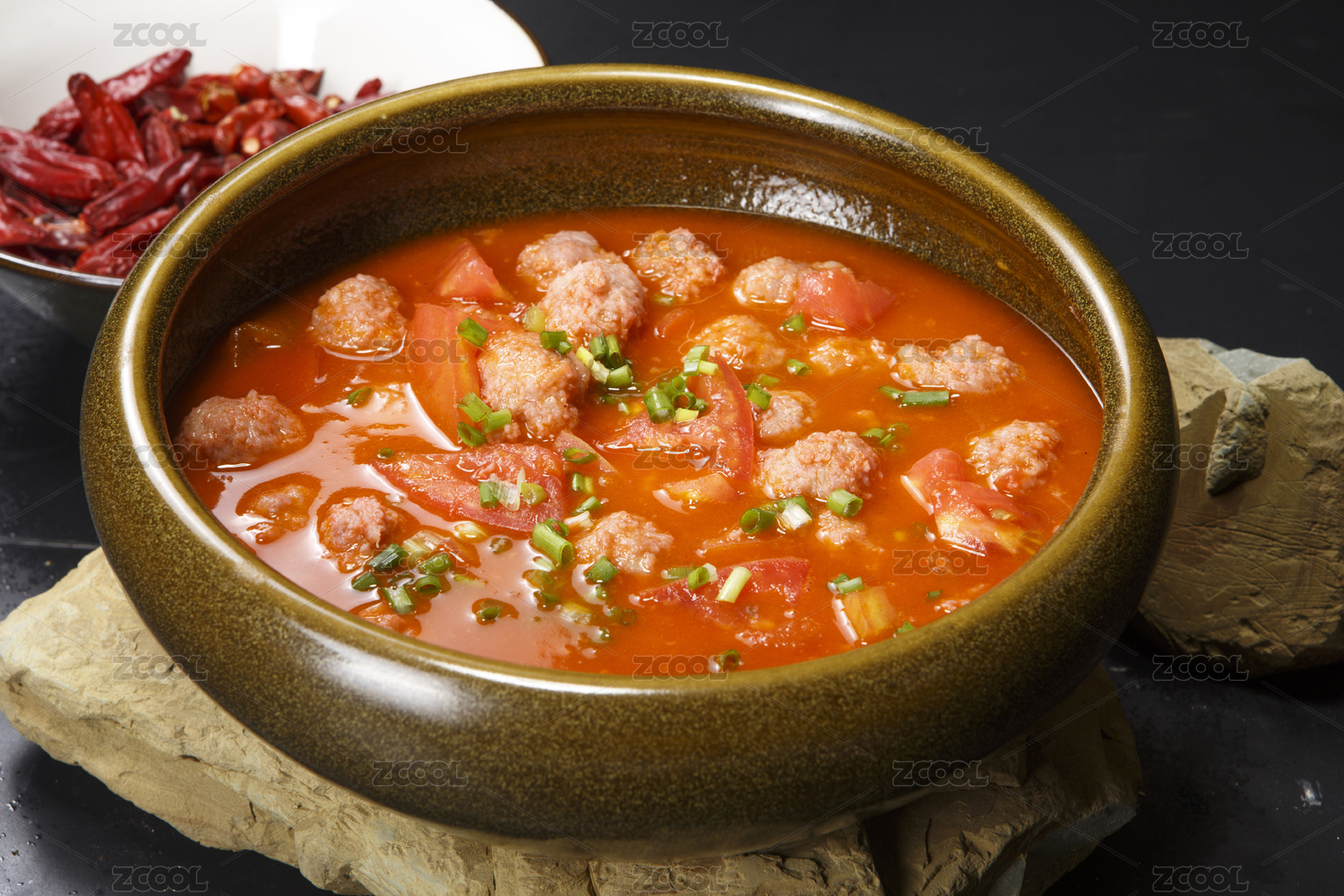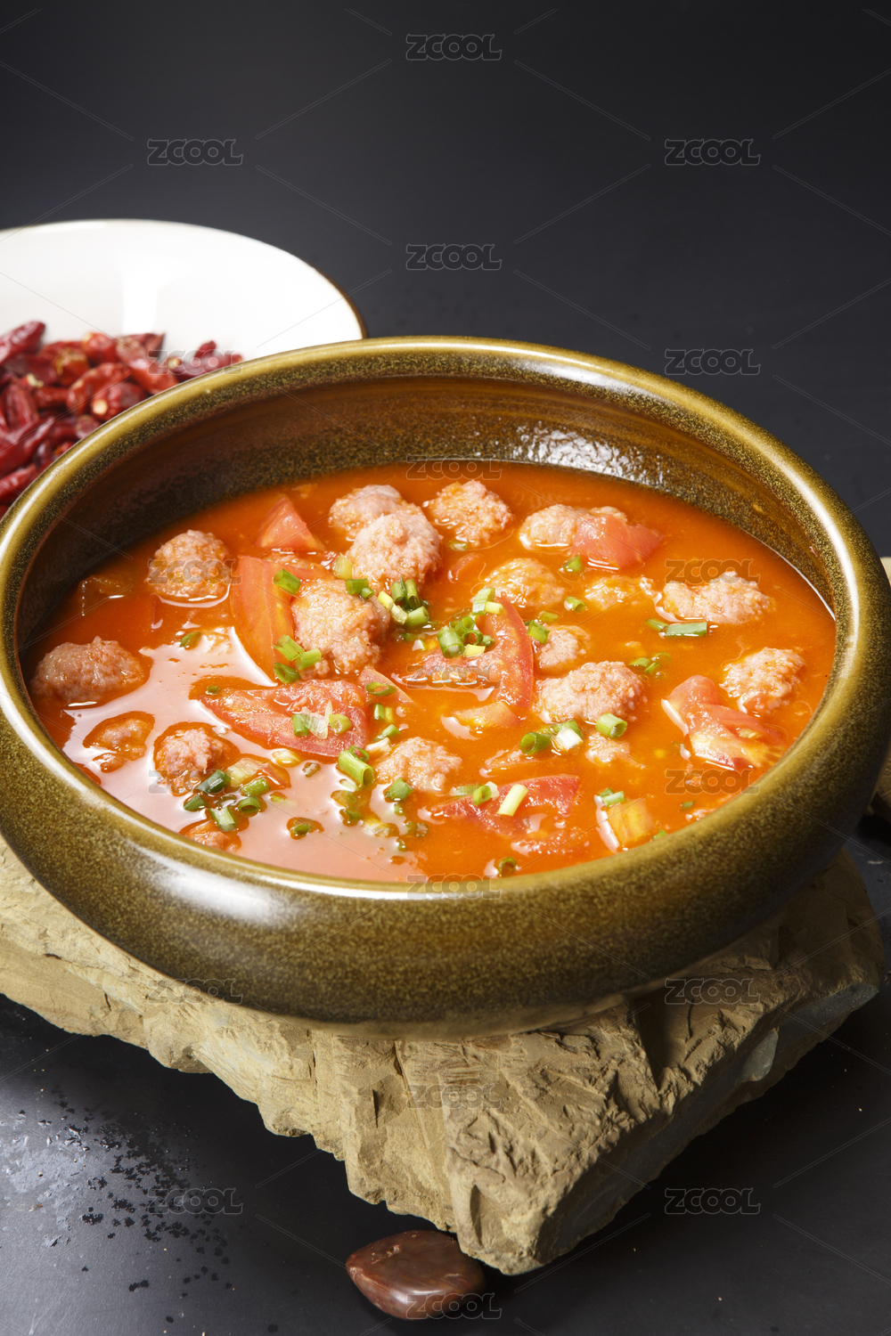 瓷缽裝的番茄燉丸子