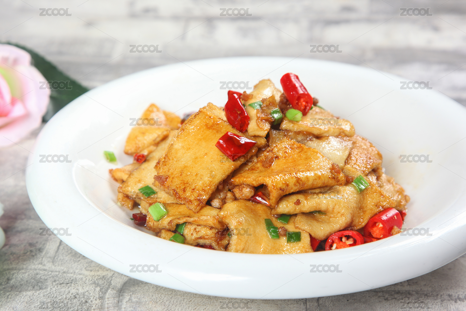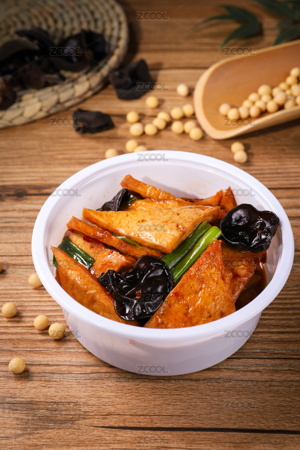 木紋背景上碗里的木耳煎豆腐