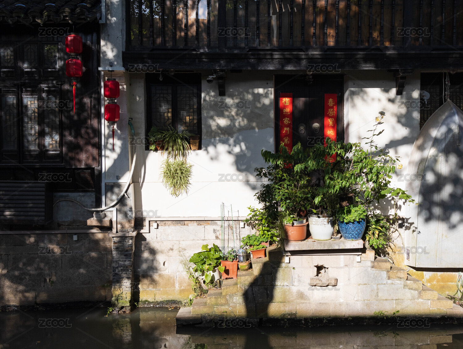 上海新場(chǎng)古鎮(zhèn)近代江南民居靠近小河陽光撒下