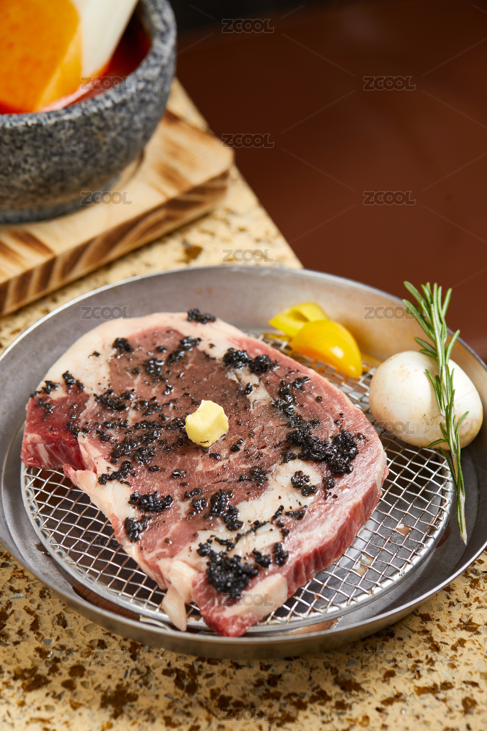 一盤現(xiàn)切肋眼牛排擺盤放桌子上