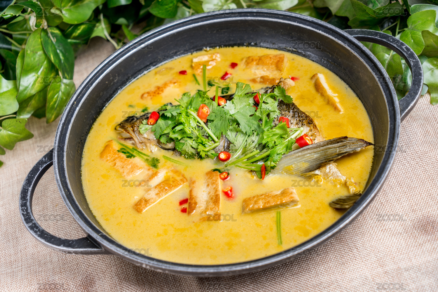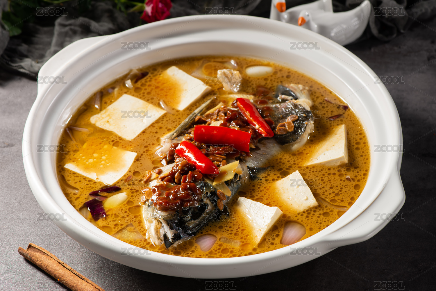 鮮美多汁的魚頭燉豆腐盛放在黑色鐵鍋中
