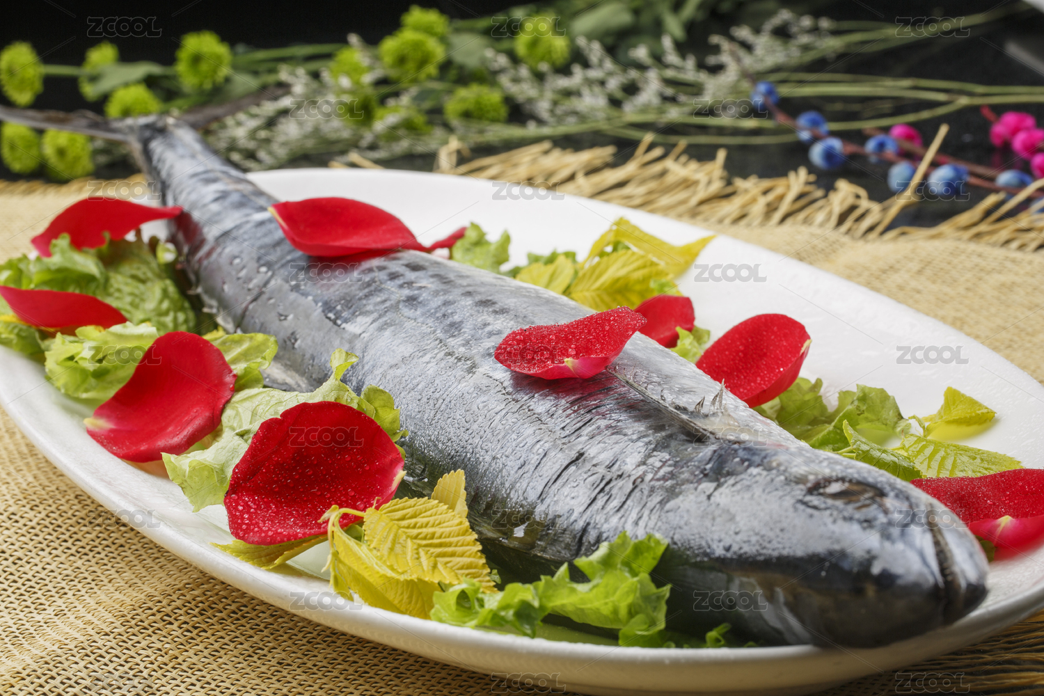 白色橢圓瓷盤裝的新鮮馬鮫魚