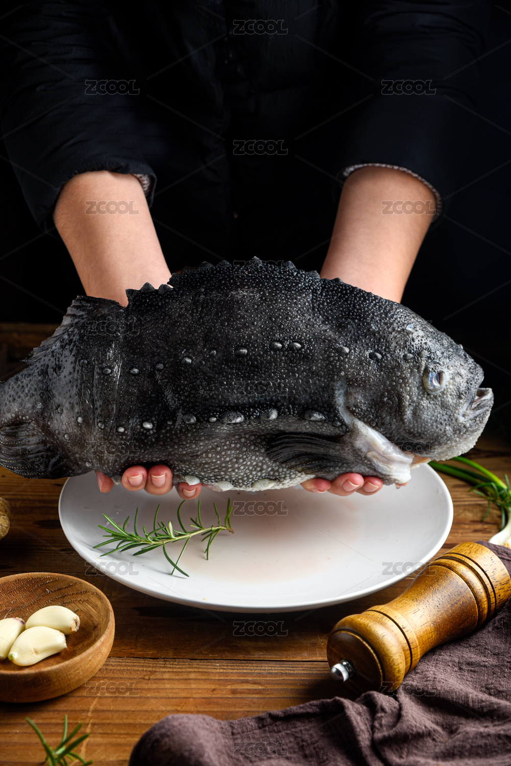 暗調(diào)手持海參斑盤子里的海魚