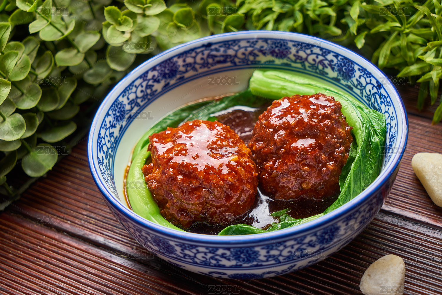 兩顆紅燒獅子頭盛放在藍(lán)邊瓷碗里面
