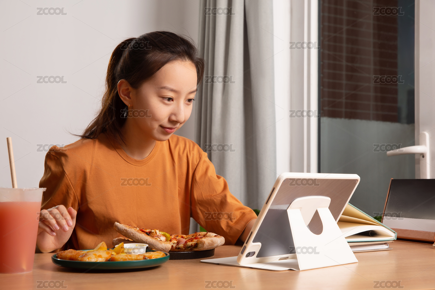 一名年輕女性在餐廳吃披薩