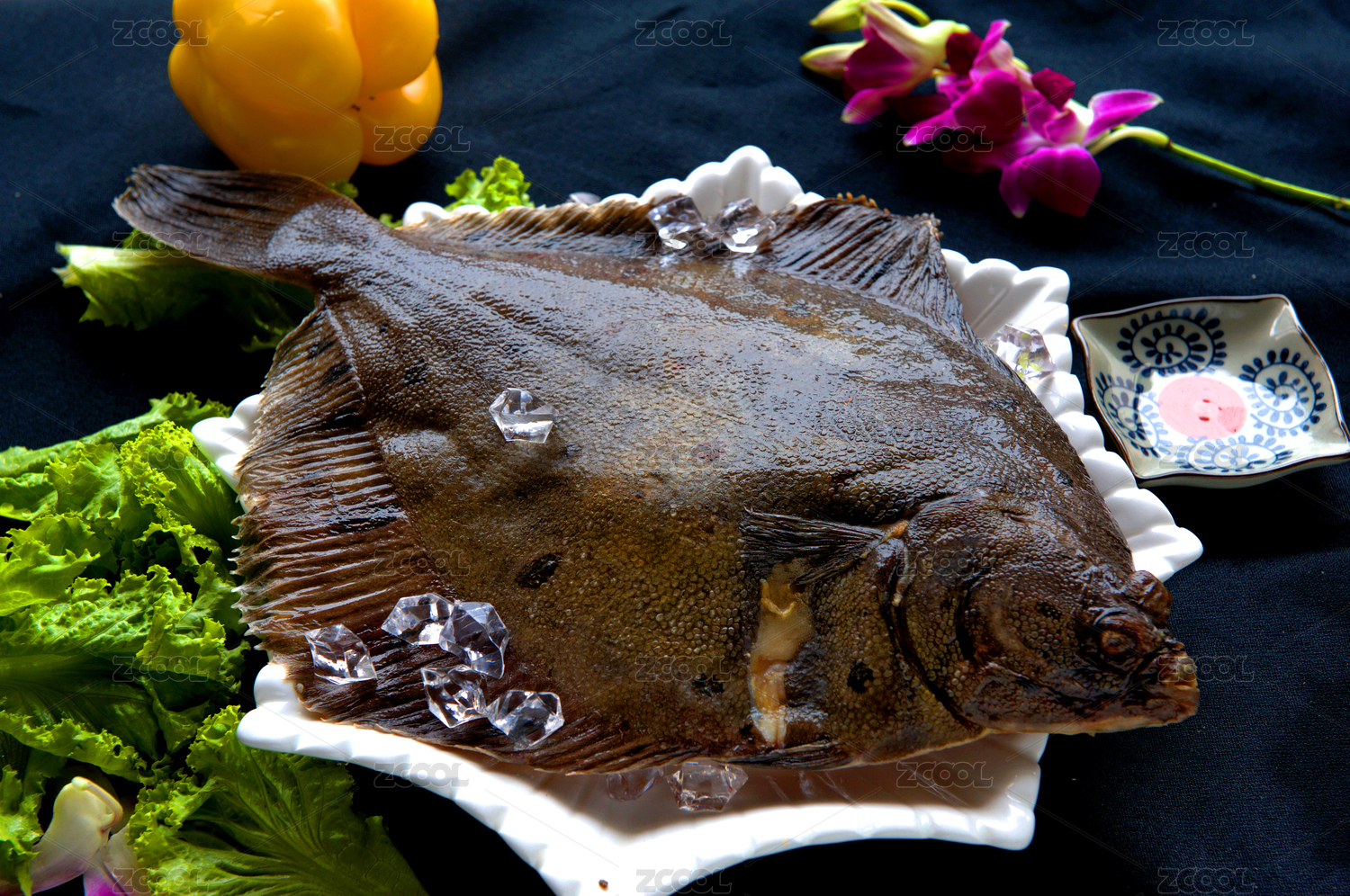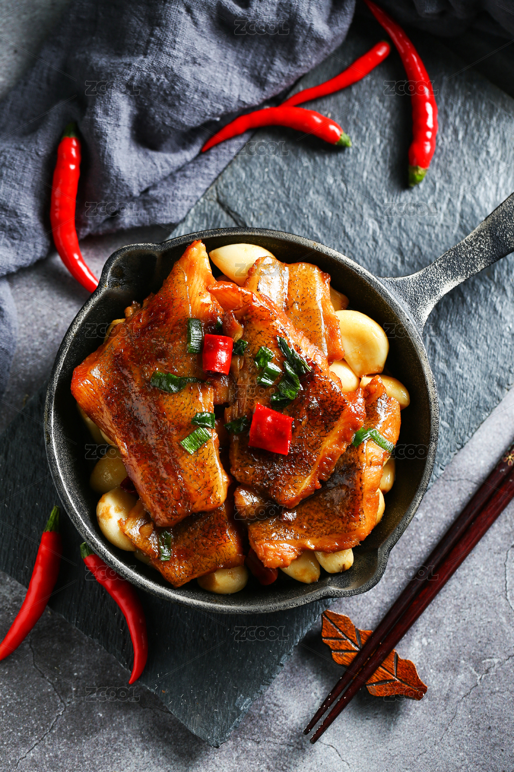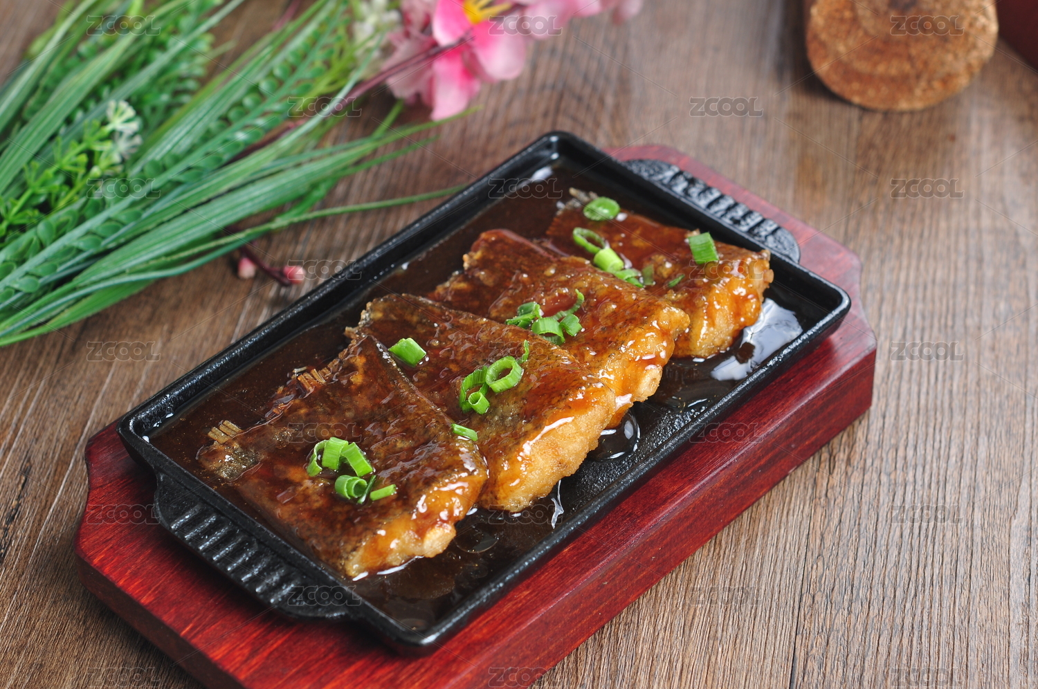 燒鰈魚放在小鐵鍋里在黑色背景上俯拍