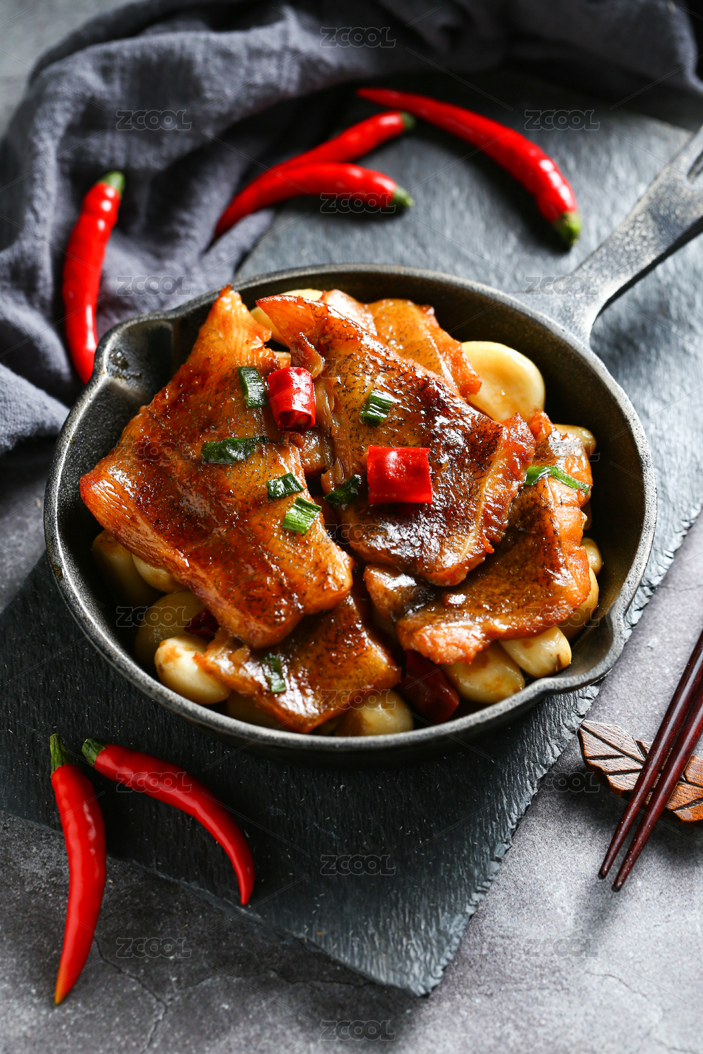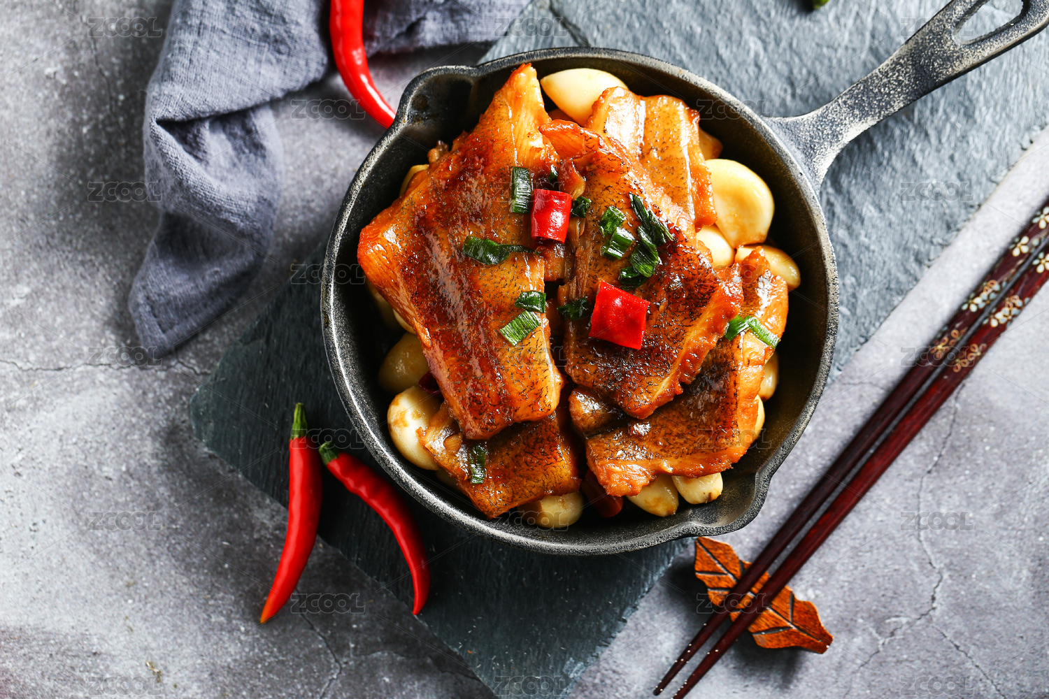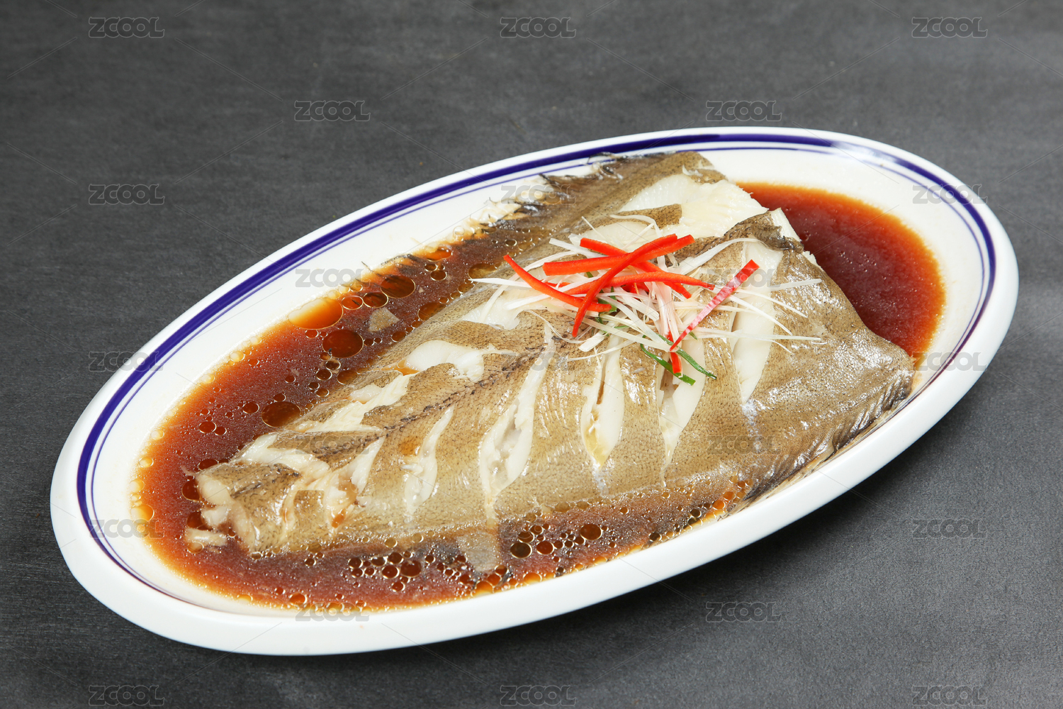 燒鰈魚放在小鐵鍋里在黑色背景上俯拍