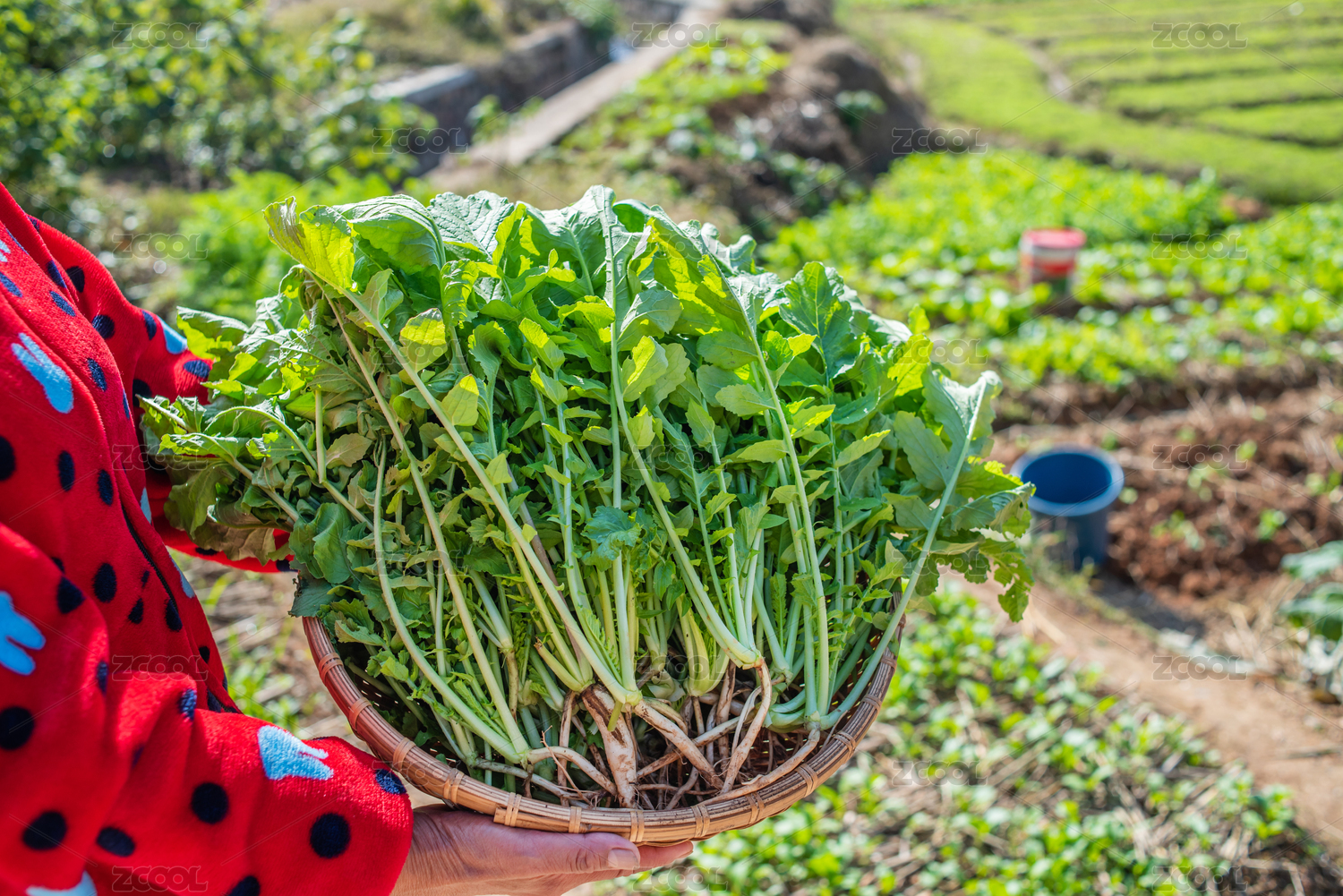 農(nóng)民手捧一籃新鮮有機(jī)蔬菜蘿卜苗