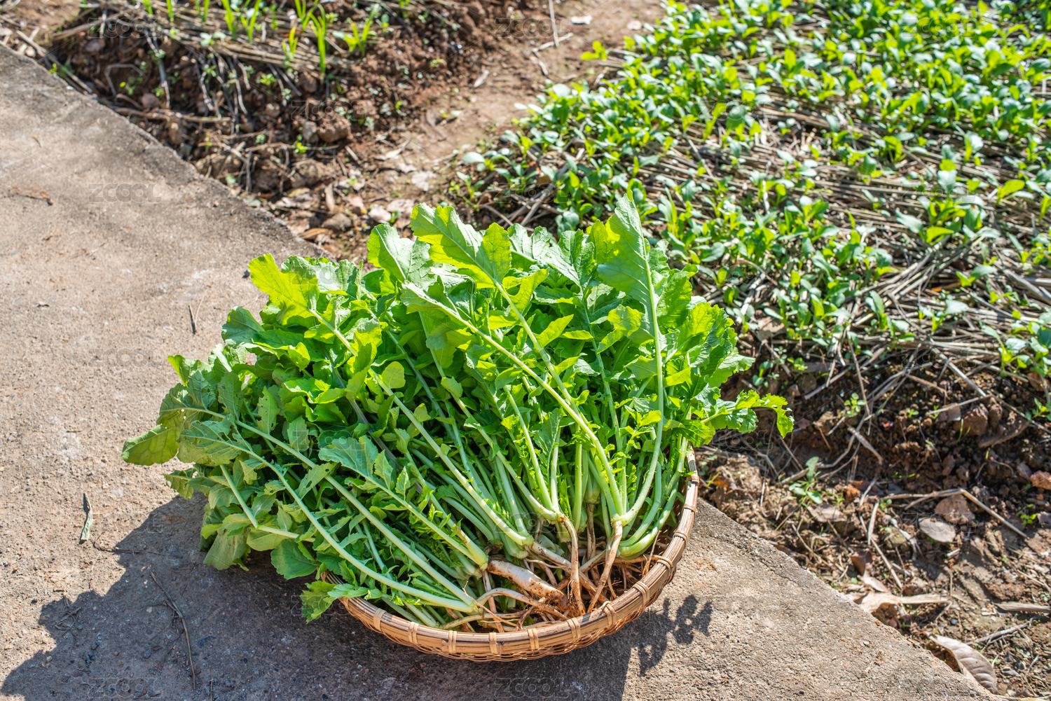 菜地上一籃新鮮有機(jī)蔬菜蘿卜苗