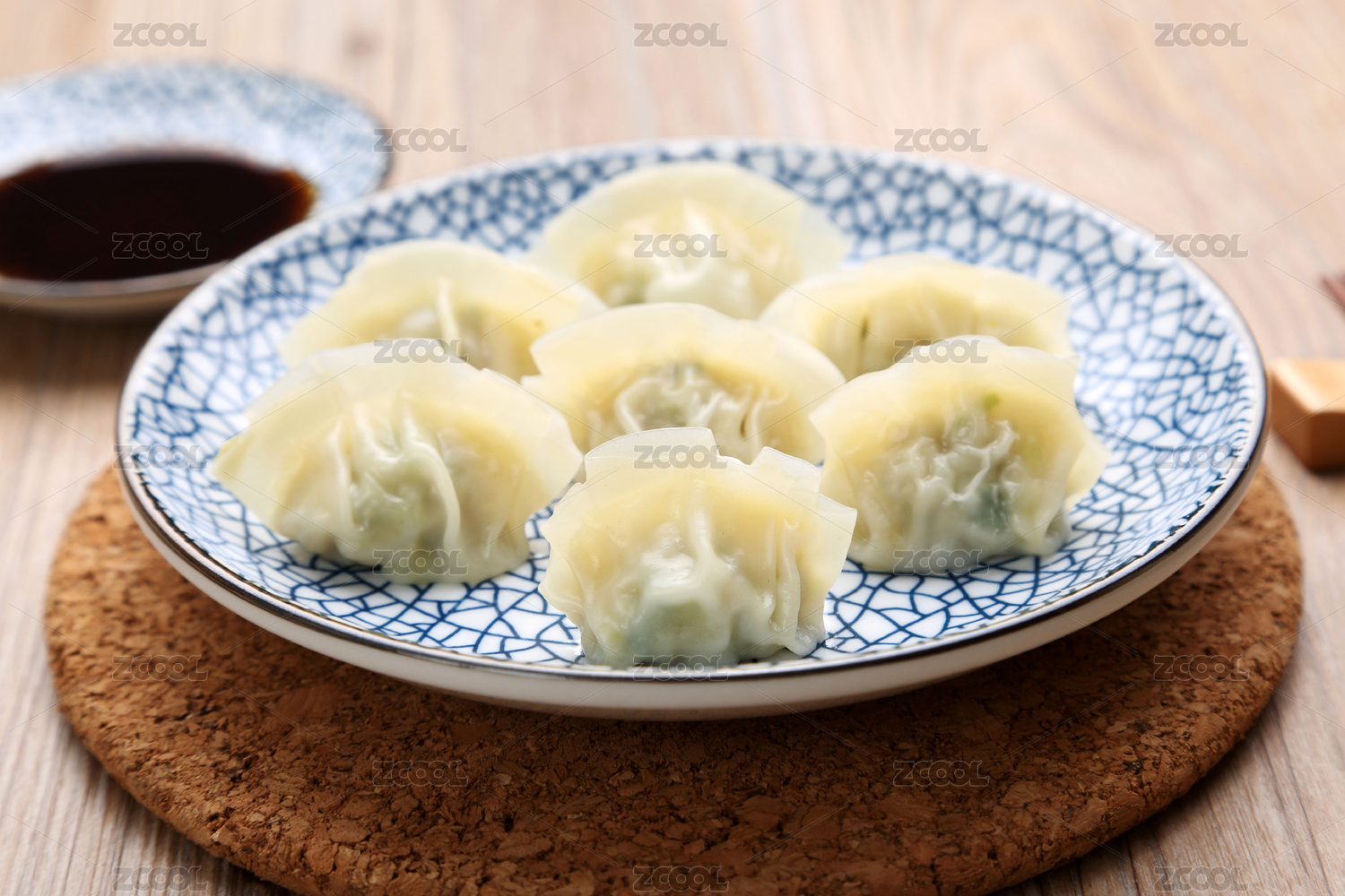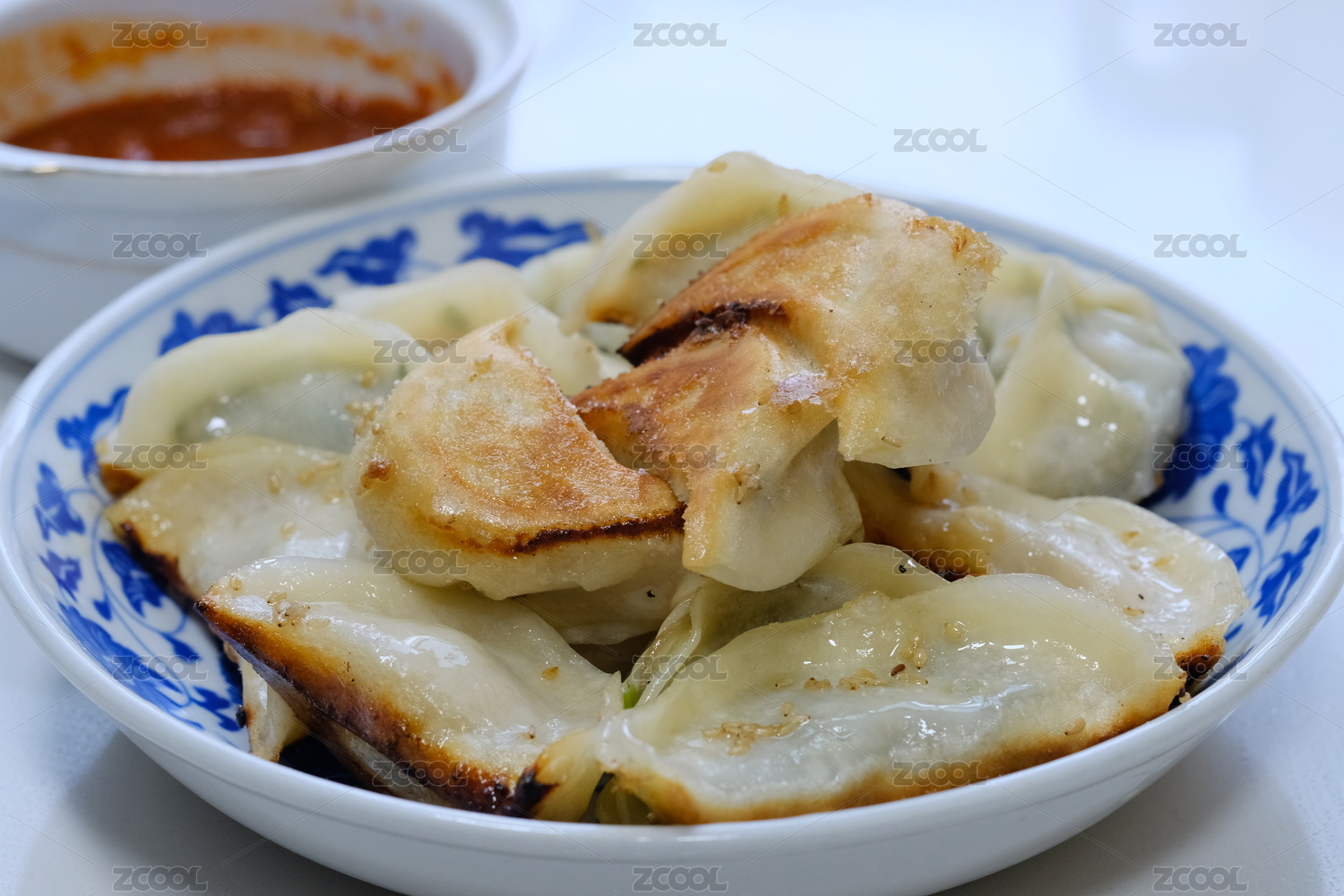 藍(lán)色青花瓷盤盛放的老上海煎餃