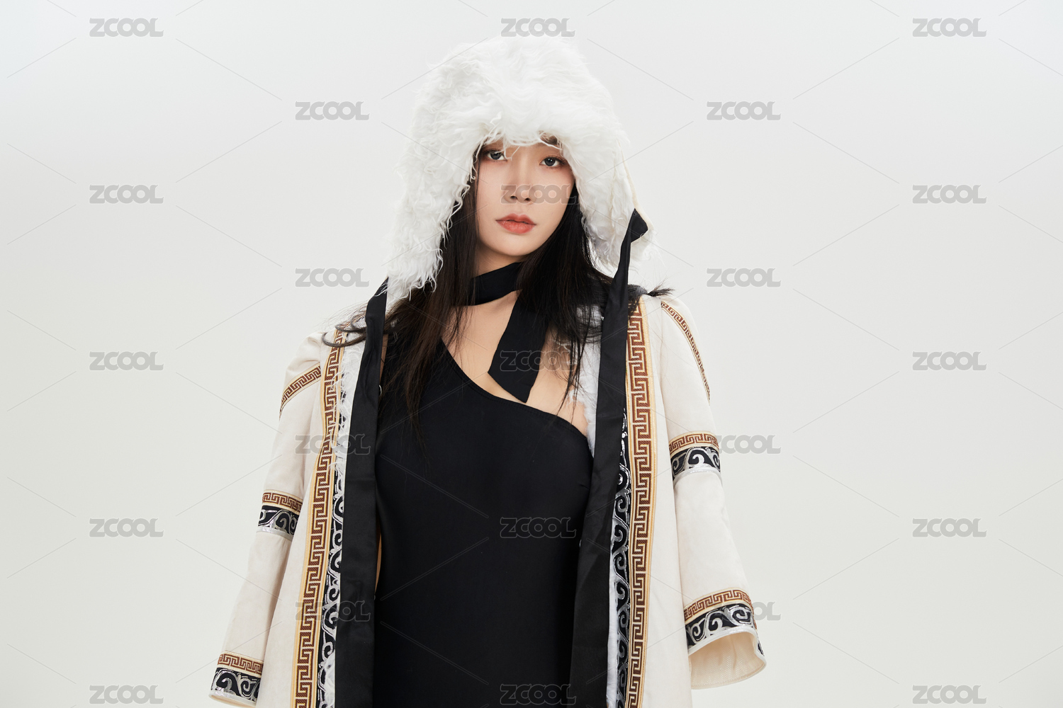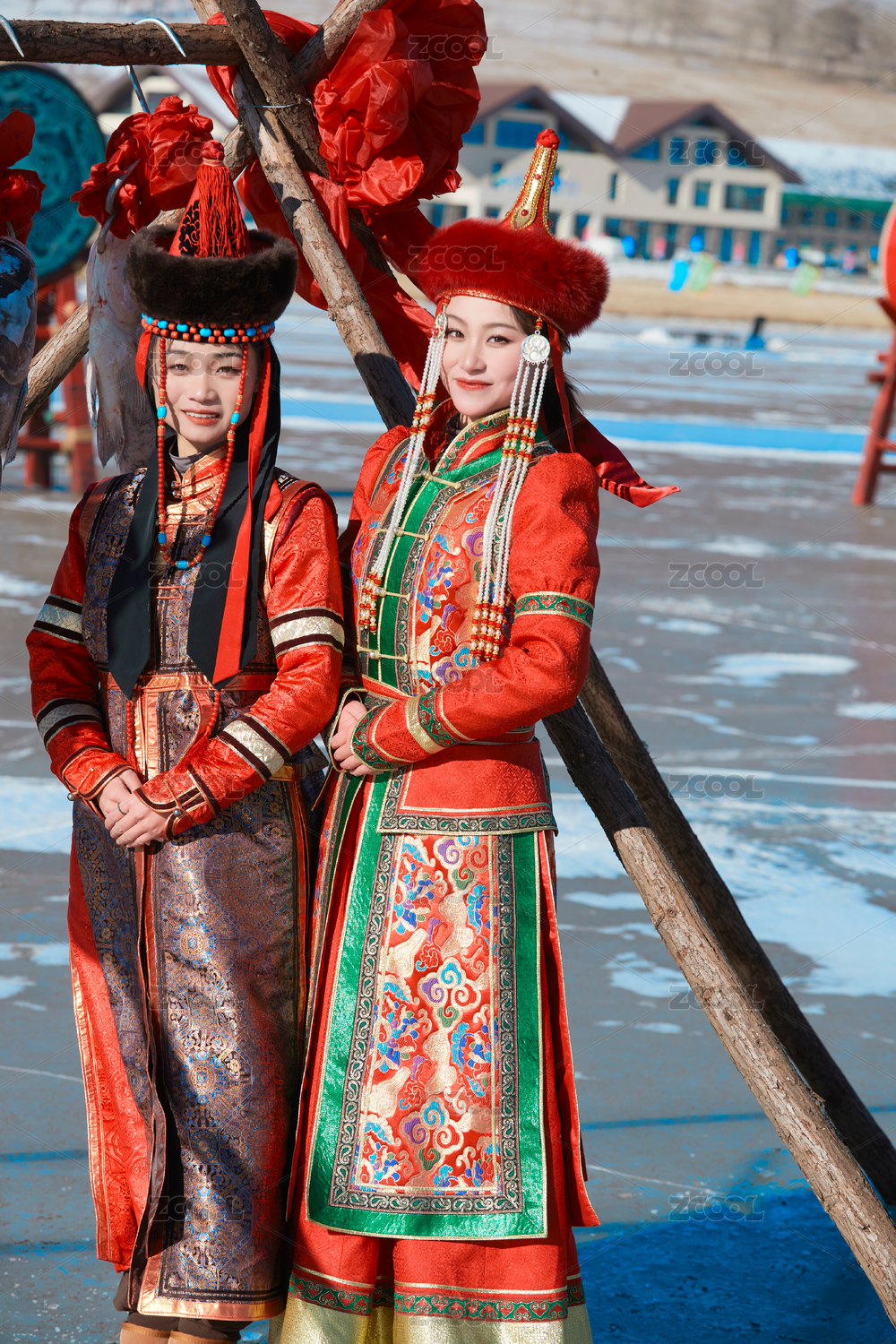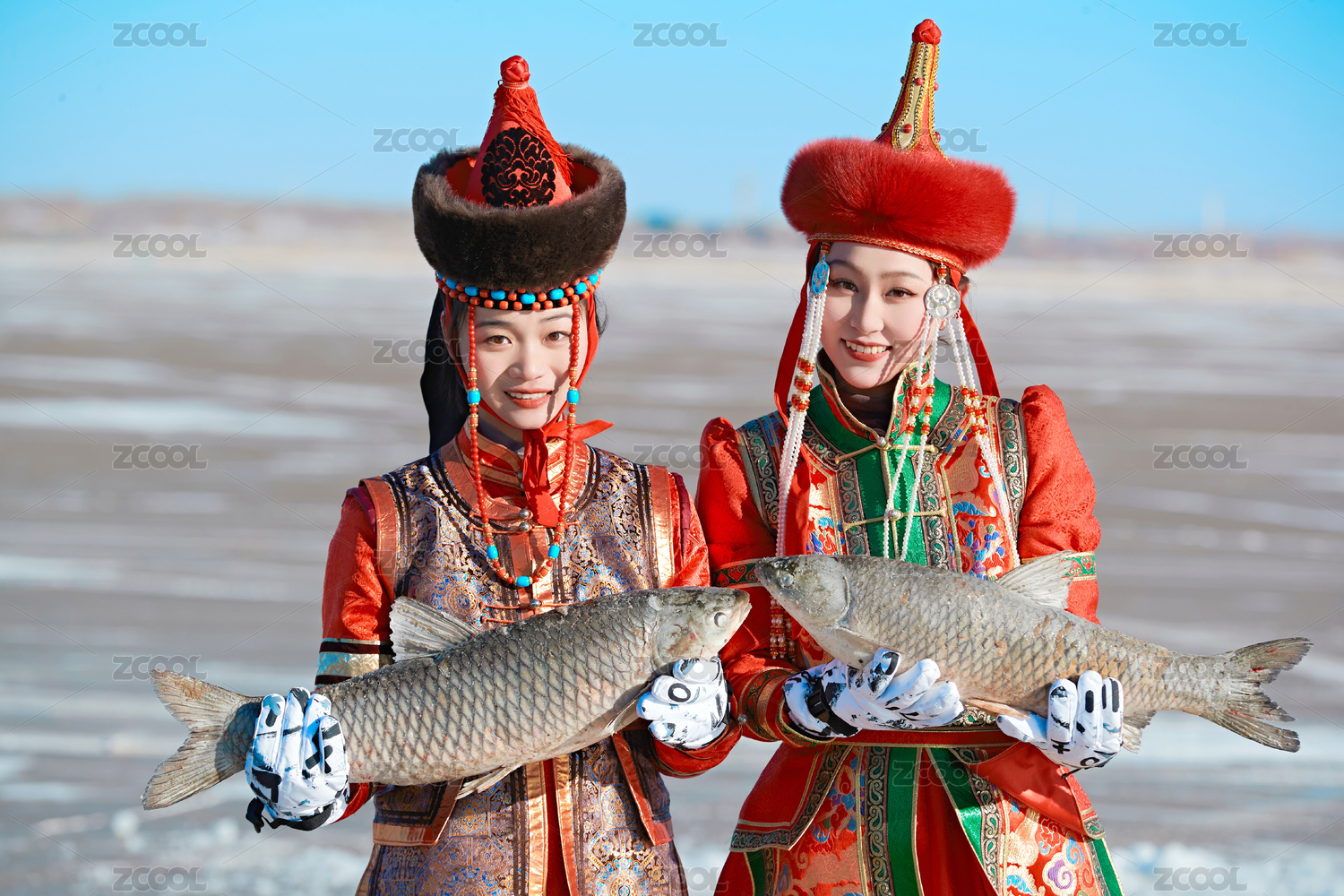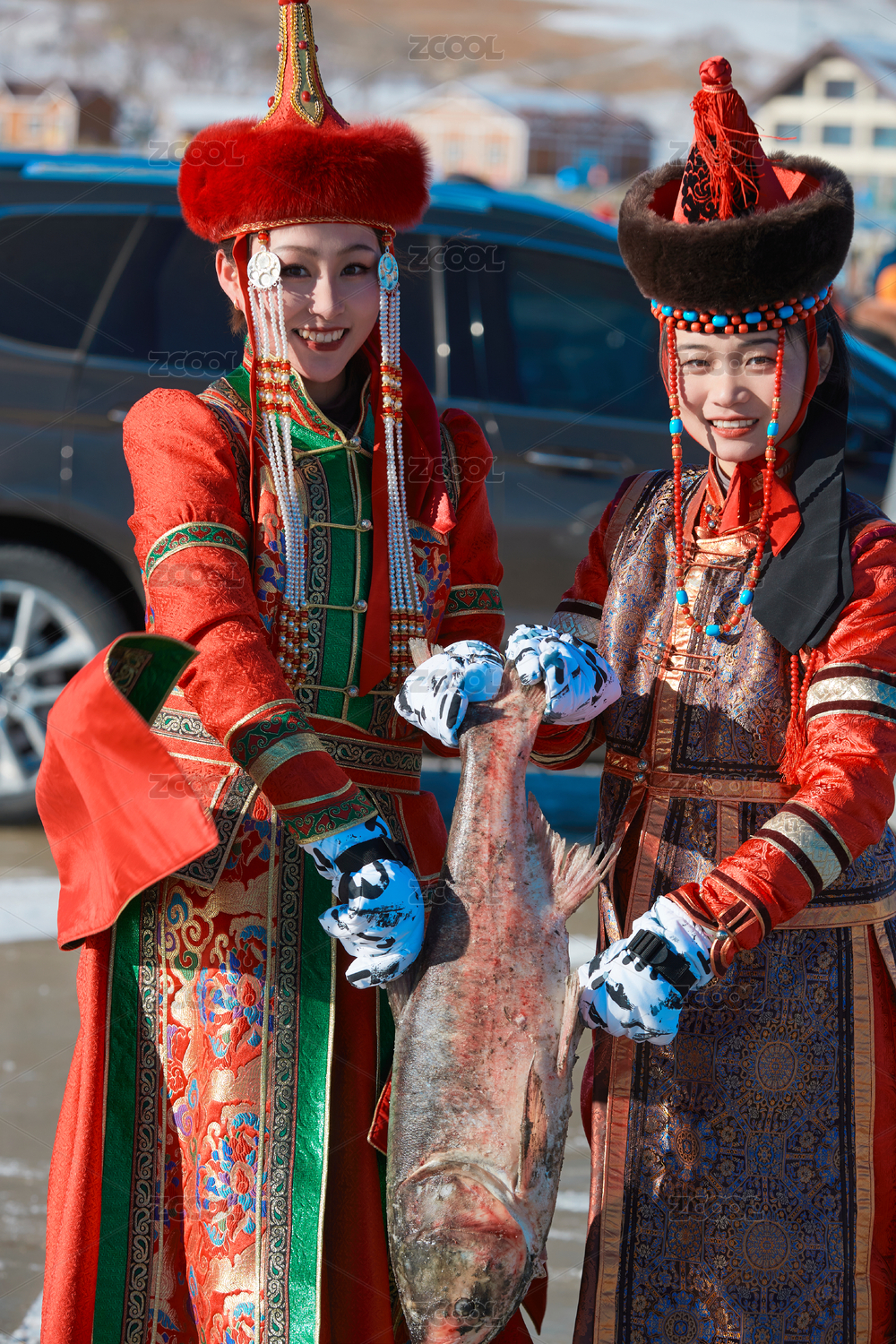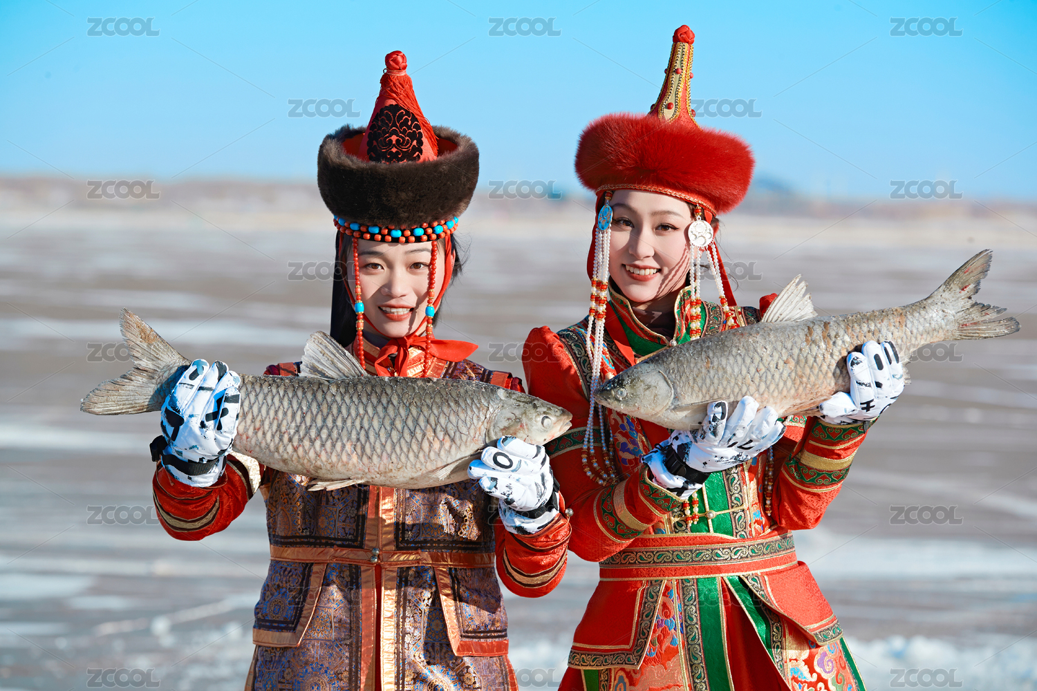 穿著蒙族服飾參加冬季捕魚活動的閨蜜少女