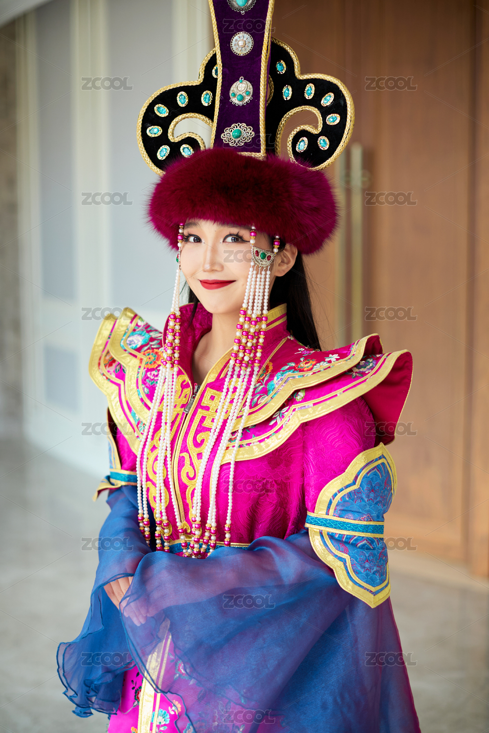 穿著華麗蒙族服飾的蒙古族年輕女性在室內(nèi)
