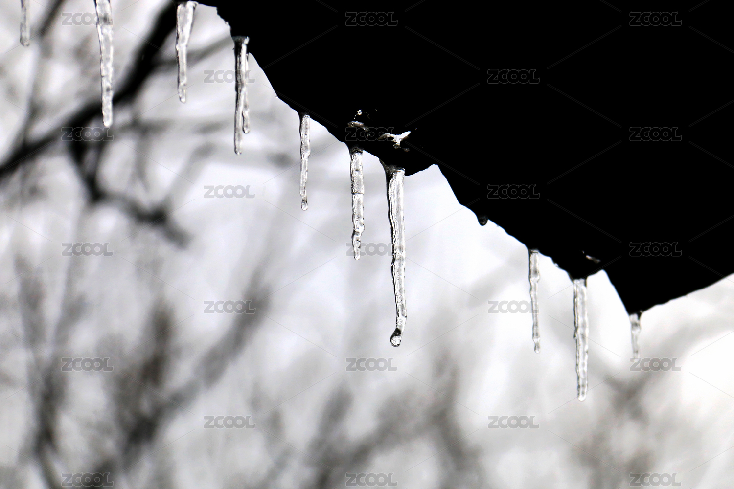 寒冷的冬季屋檐下垂落的冰柱