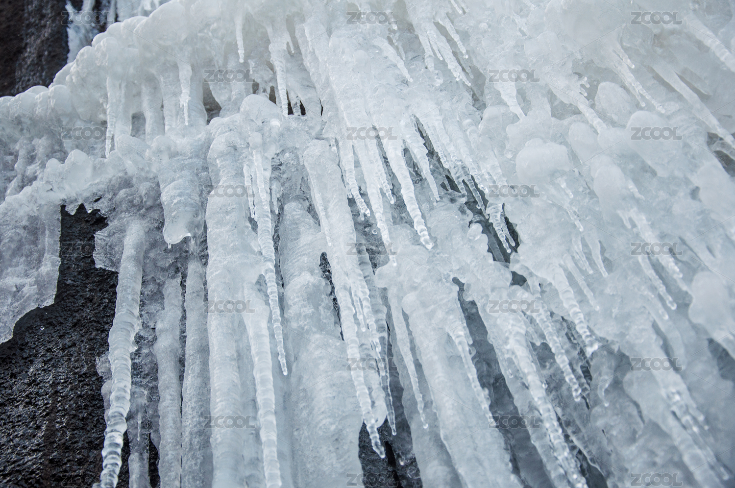 冬季戶外冰瀑上的冰柱局部特寫