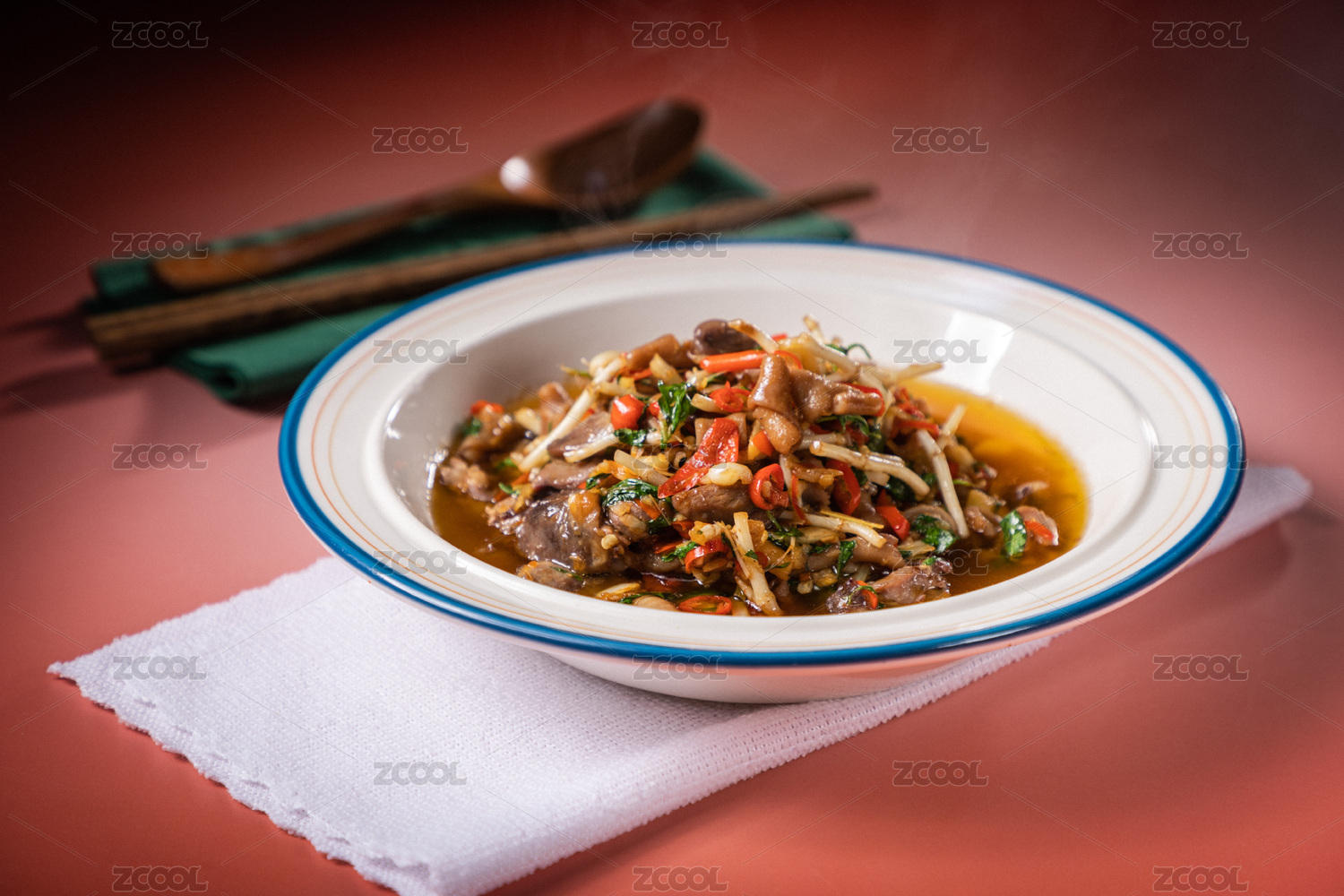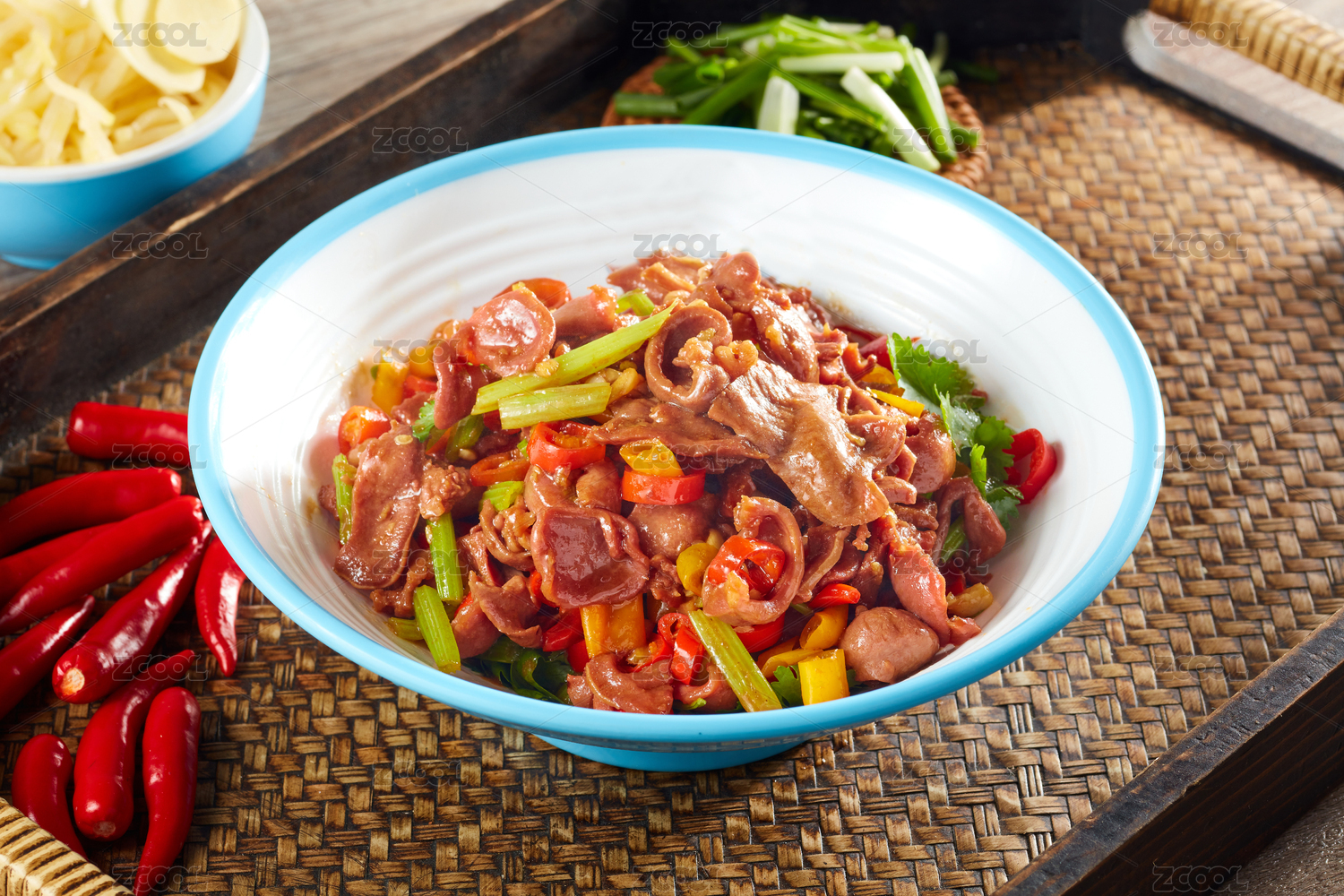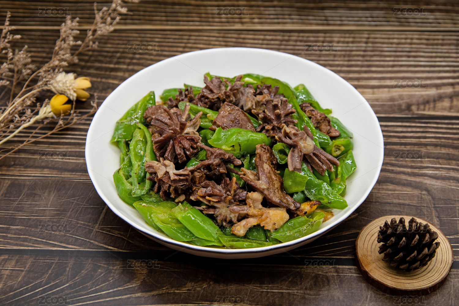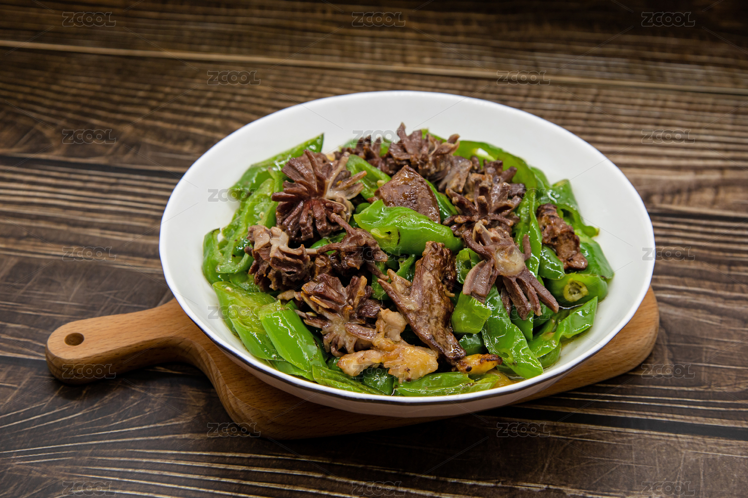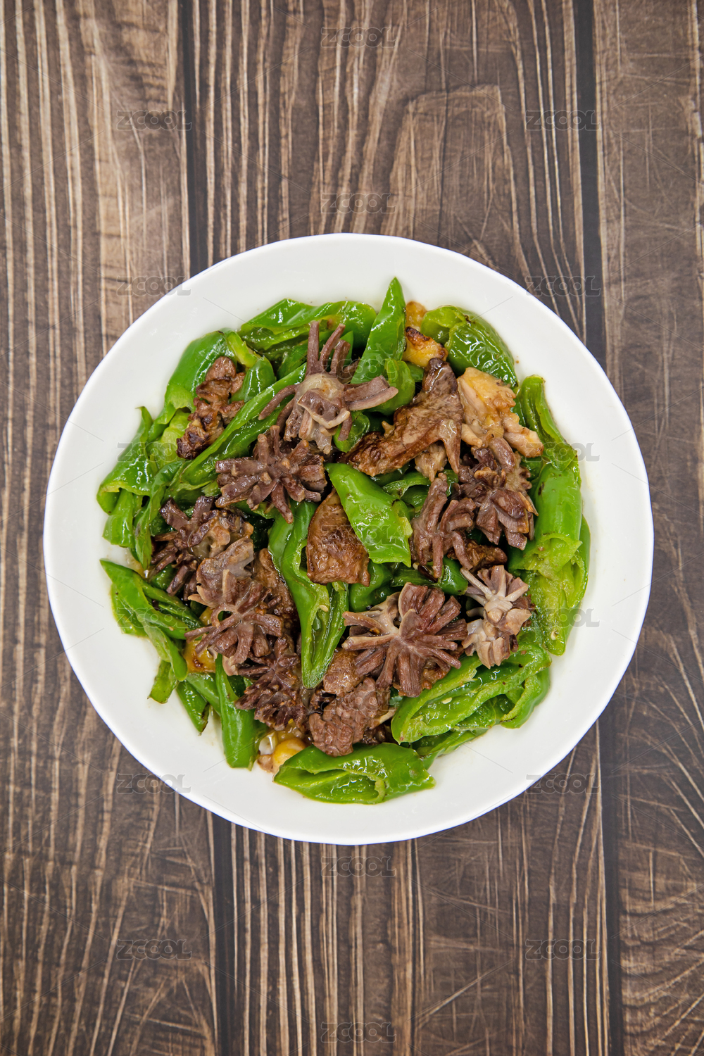 木桌背景一盤辣椒炒雞雜