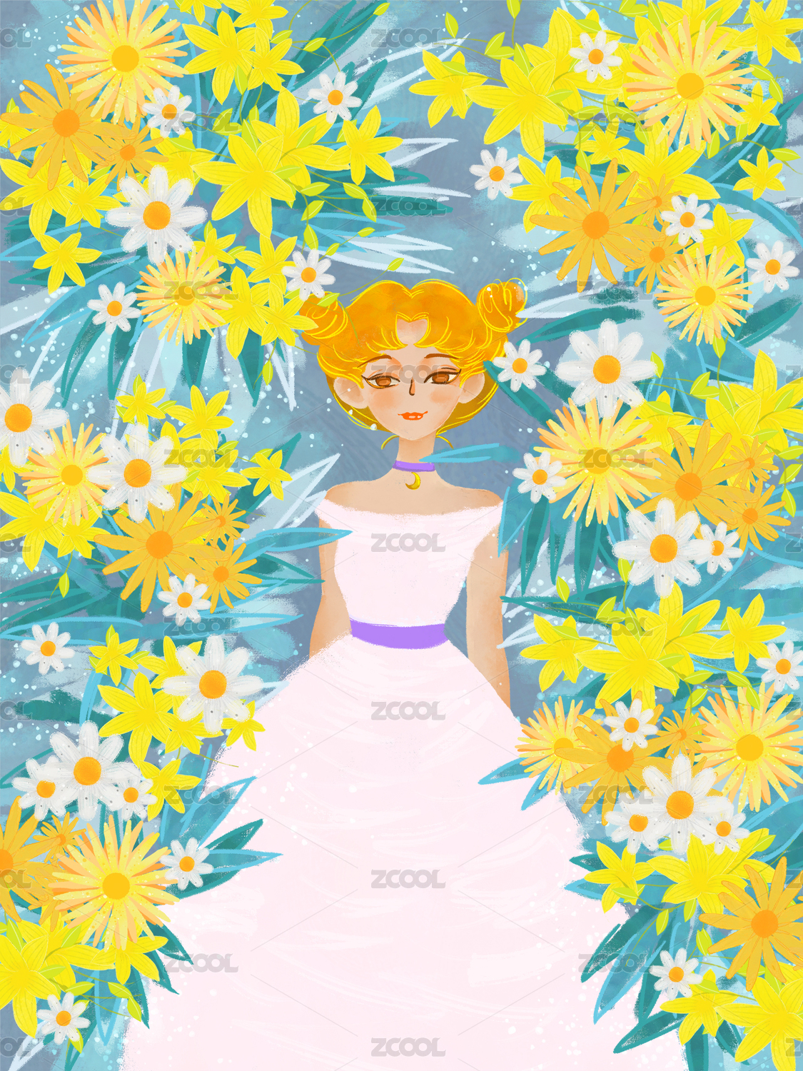 穿著粉色禮服的少女站在黃色花叢中