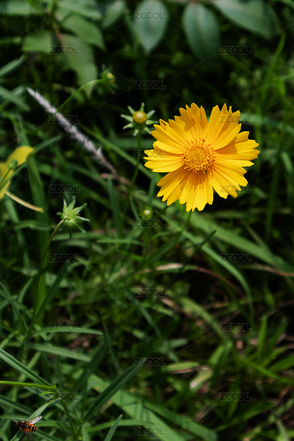 蜜蜂在金黃色金雞菊上采蜜