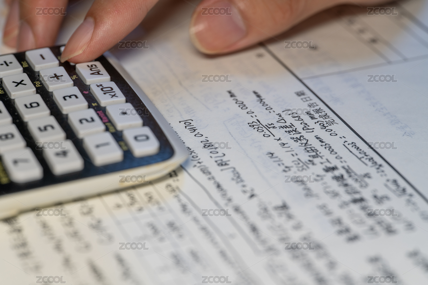 晚上桌面上手拿計算器算賬的局部特寫
