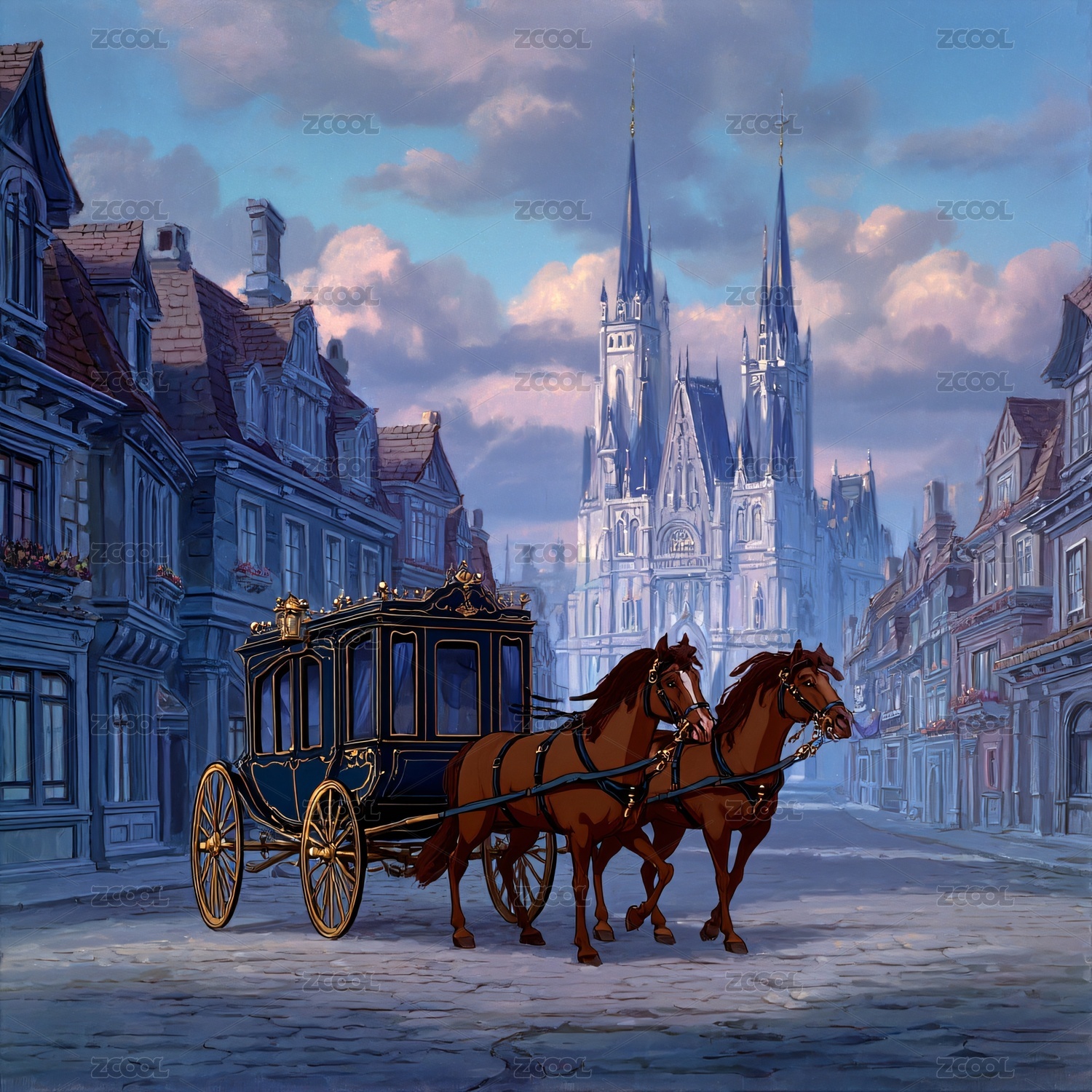 復(fù)古街道上的雙馬馬車場景
