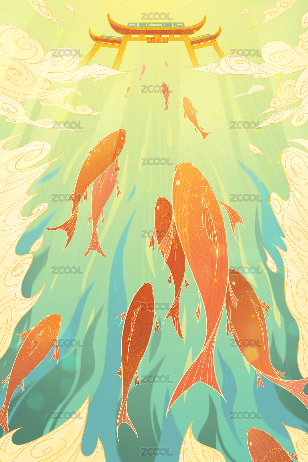 錦鯉躍龍門(mén)的中國(guó)風(fēng)插畫(huà)