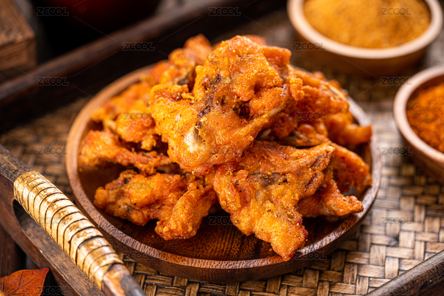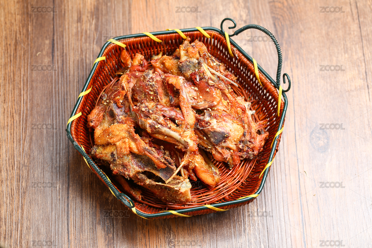 深色木板上擺放的麻辣雞架