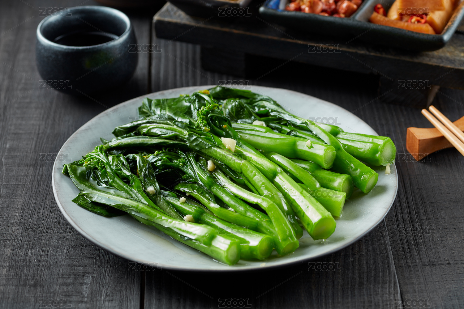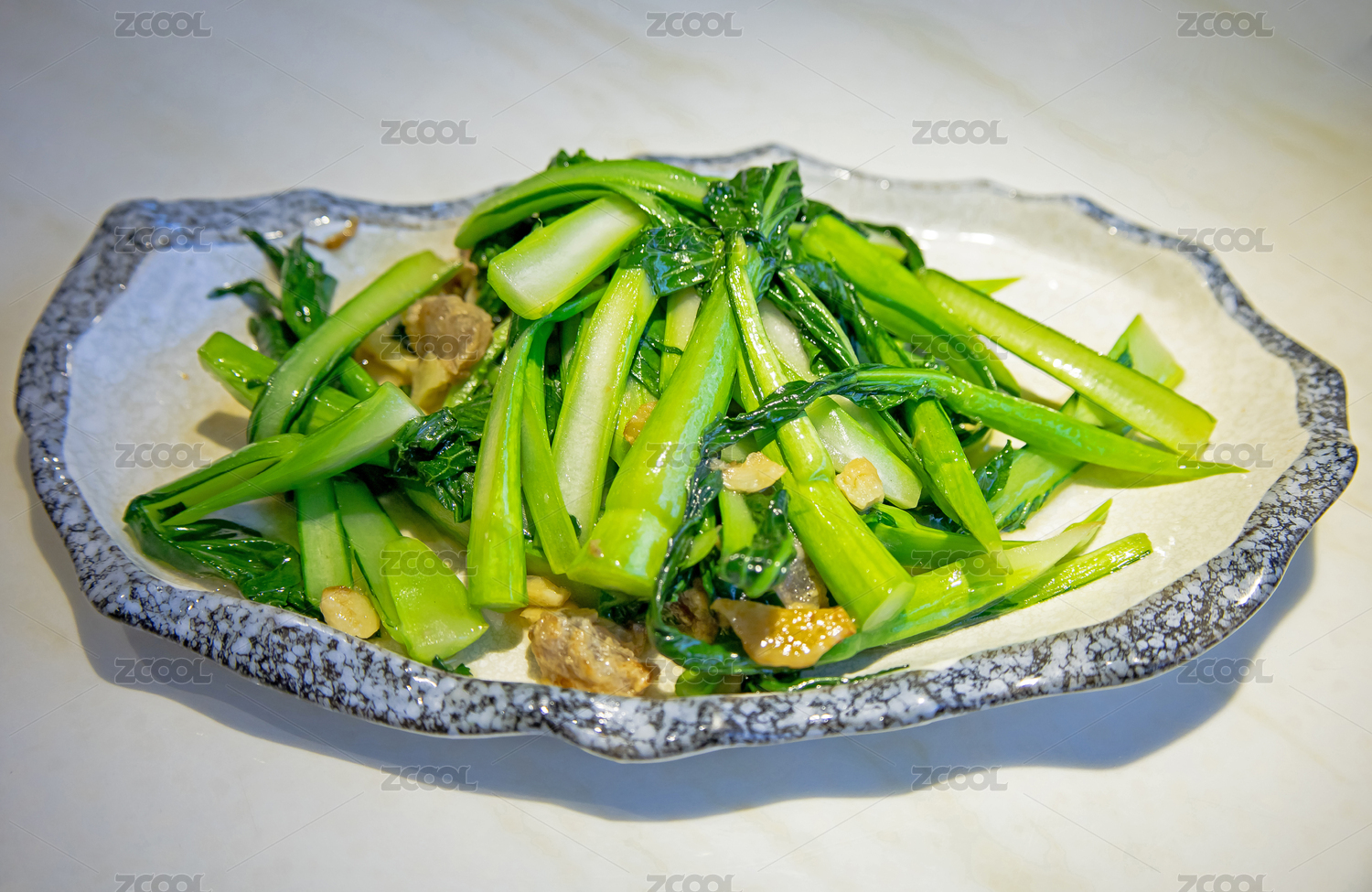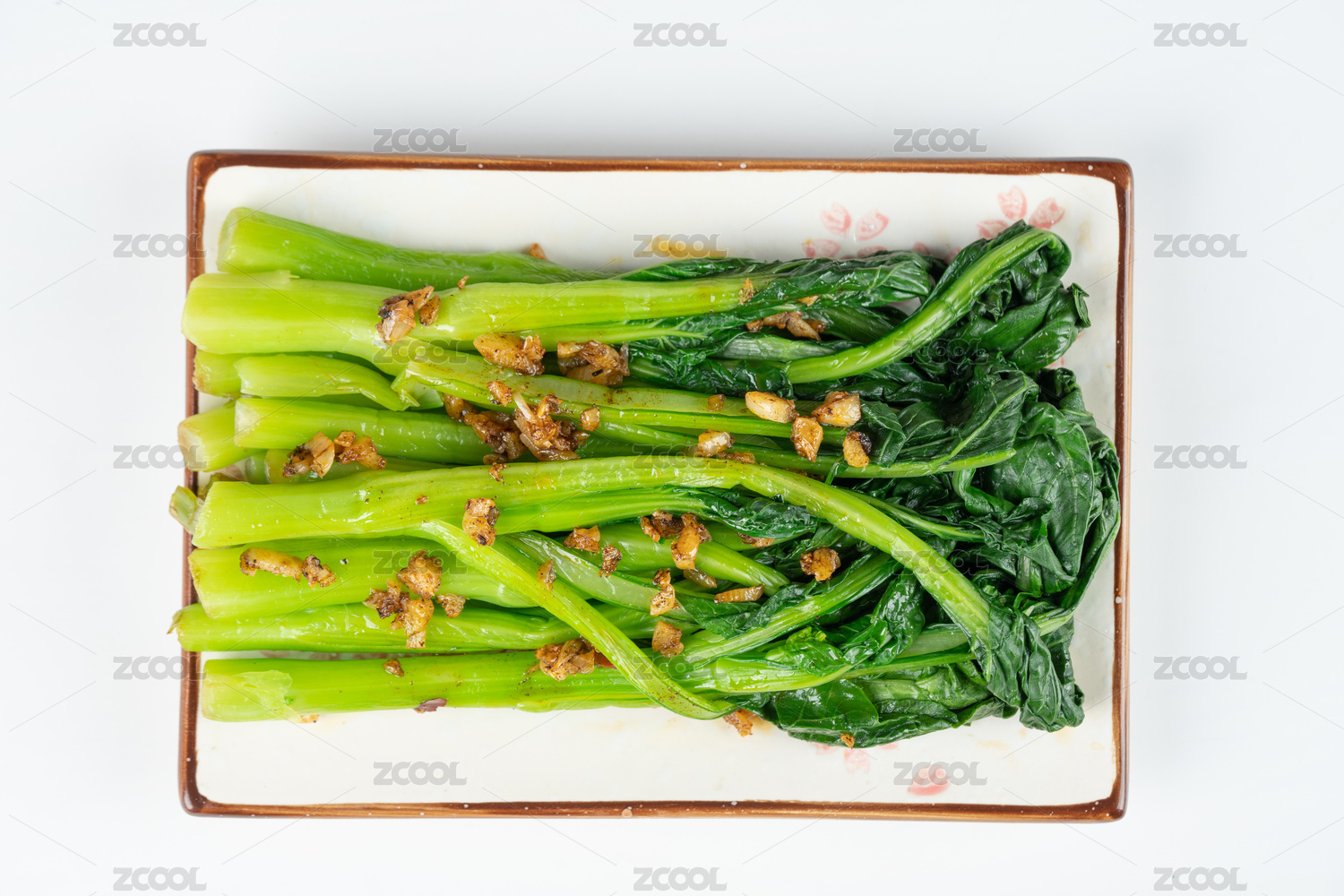 木桌背景一盤炒青菜蒜蓉炒菜心
