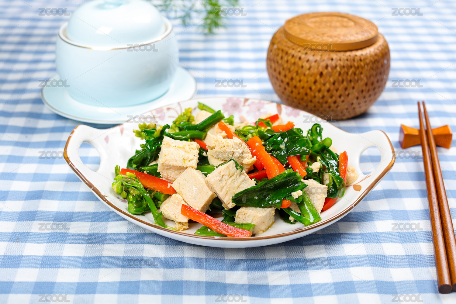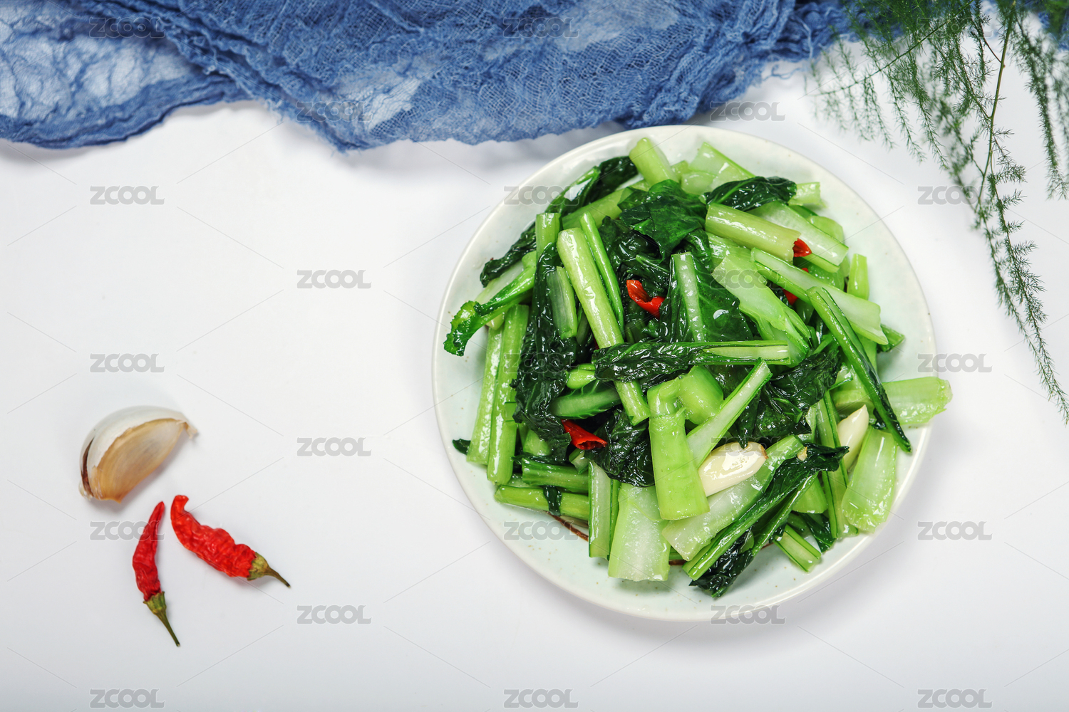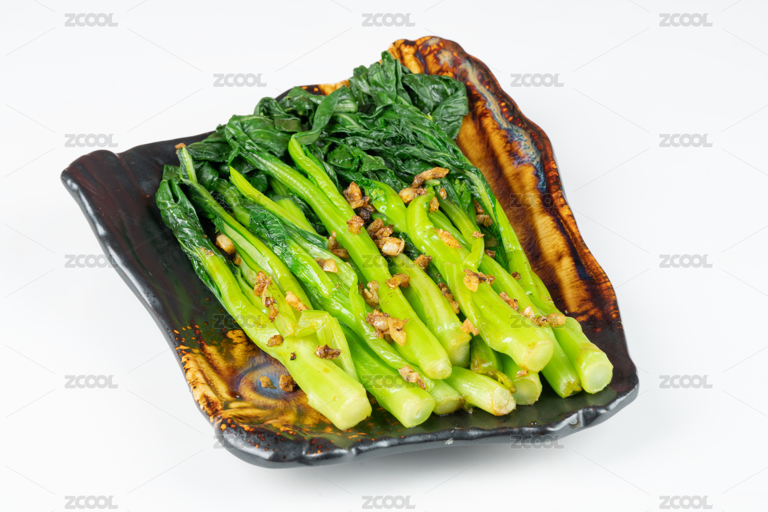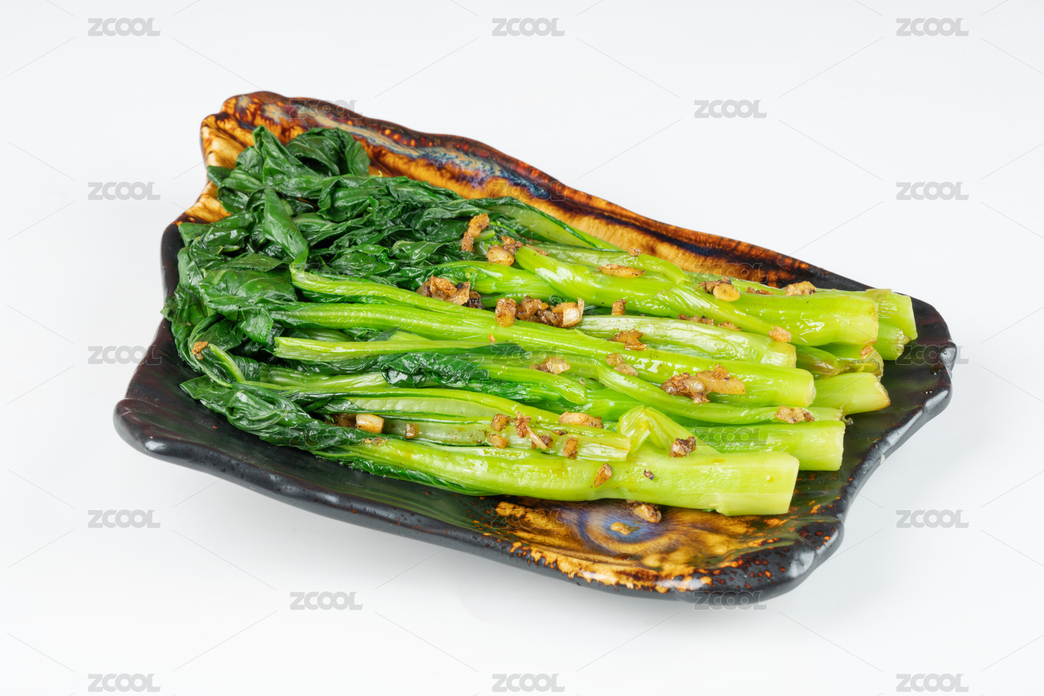木桌背景一盤炒青菜蒜蓉炒菜心
