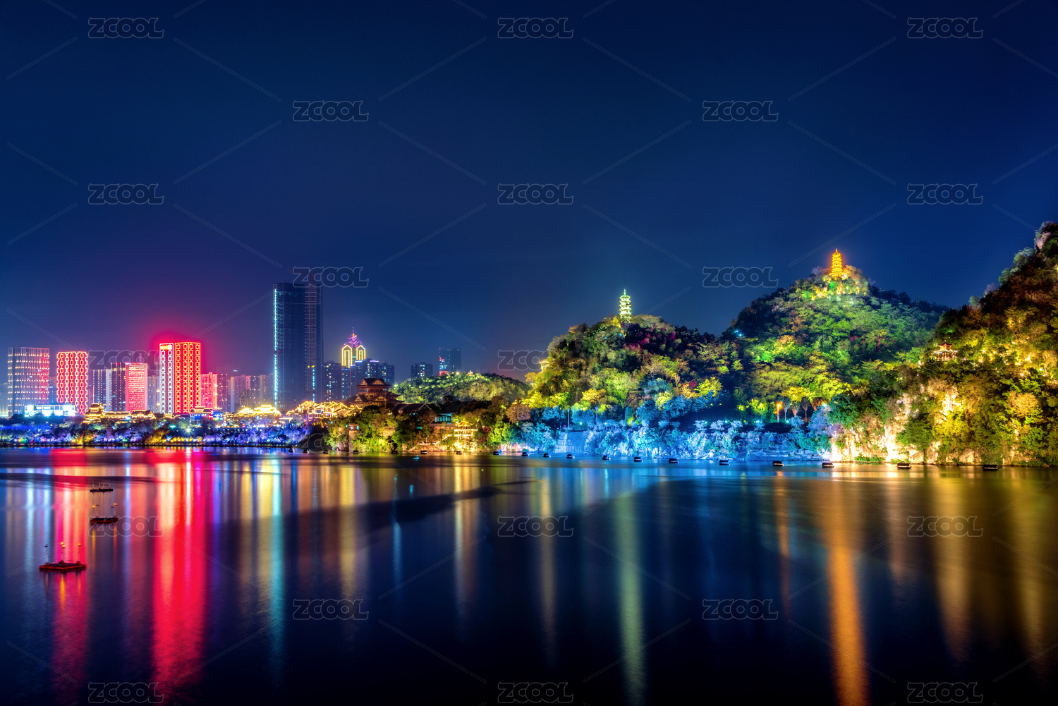 廣西柳州蟠龍山瀑布與柳江游船夜景