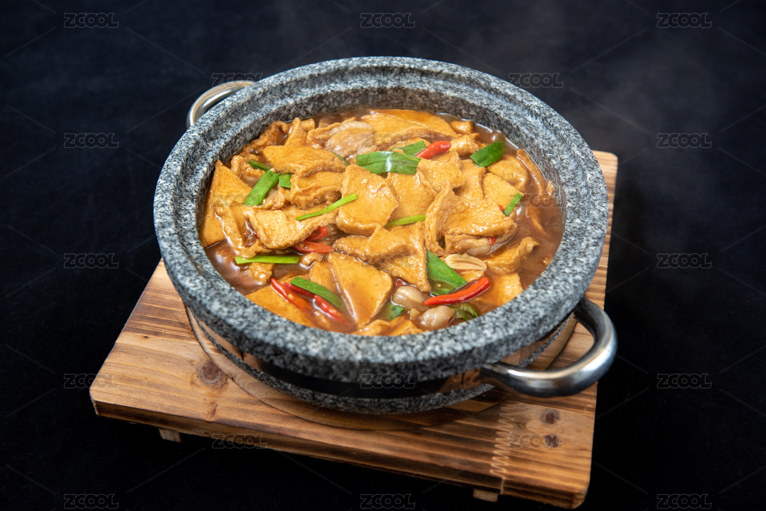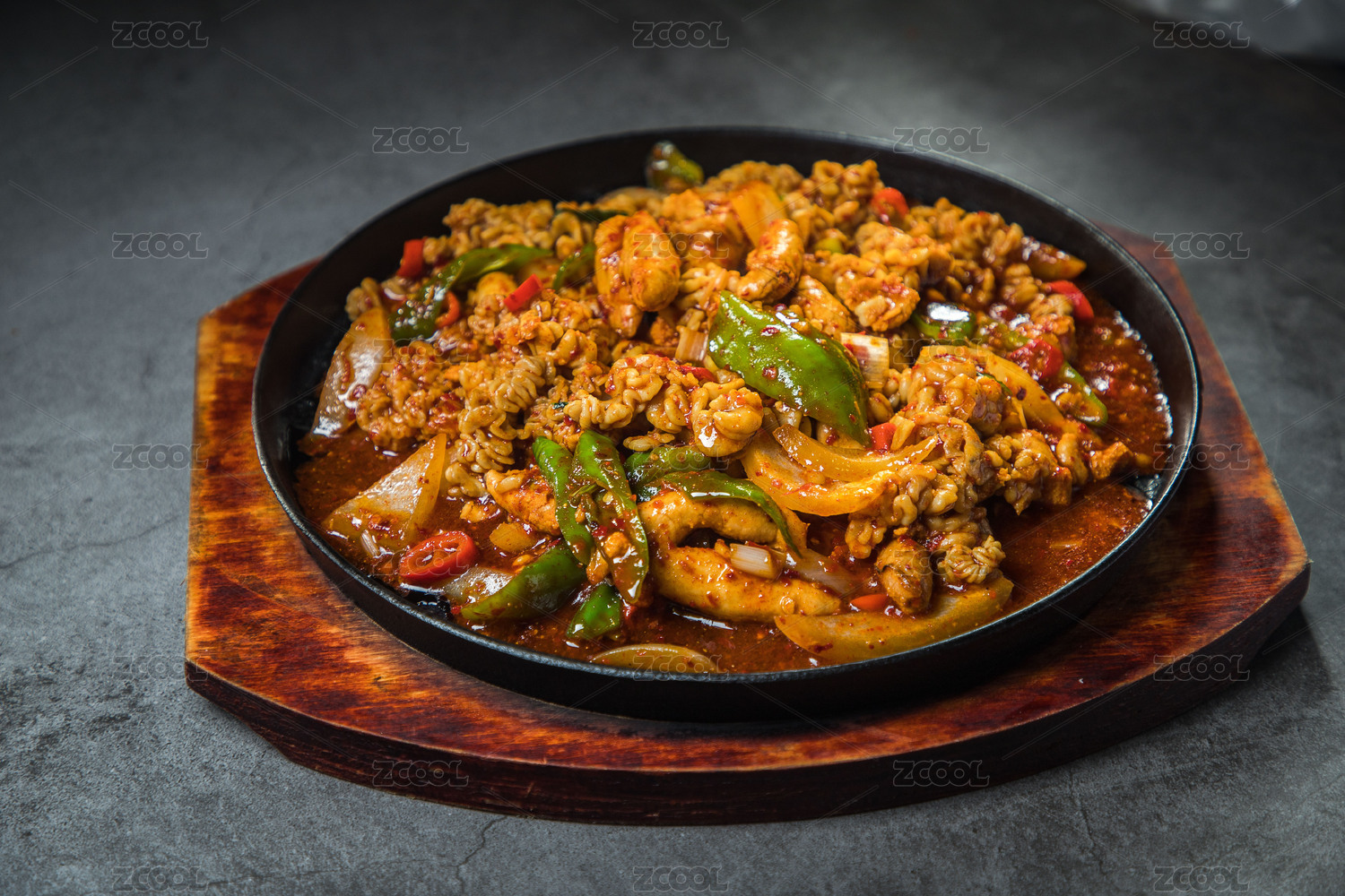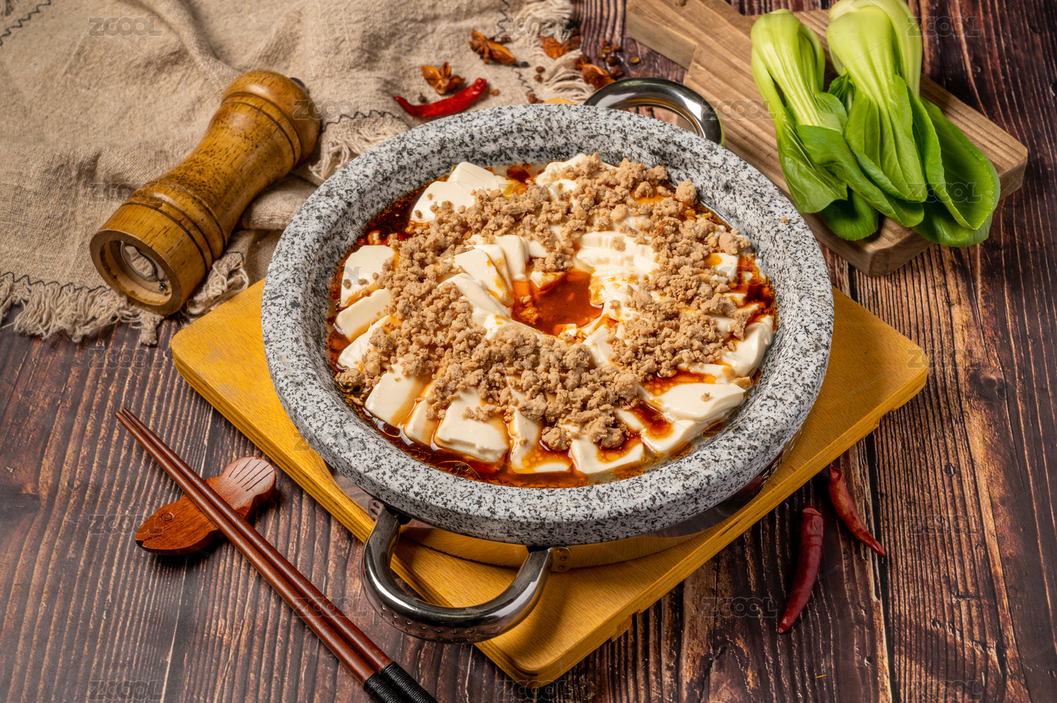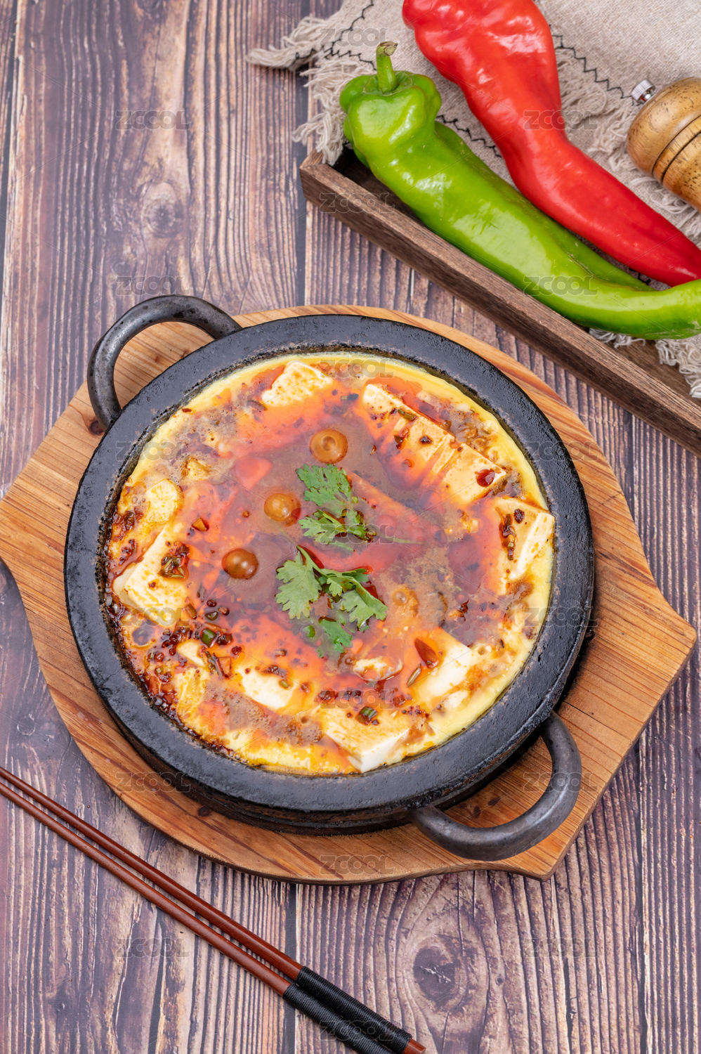 暗色水泥紋桌上放著一盤鐵板肉沫豆腐