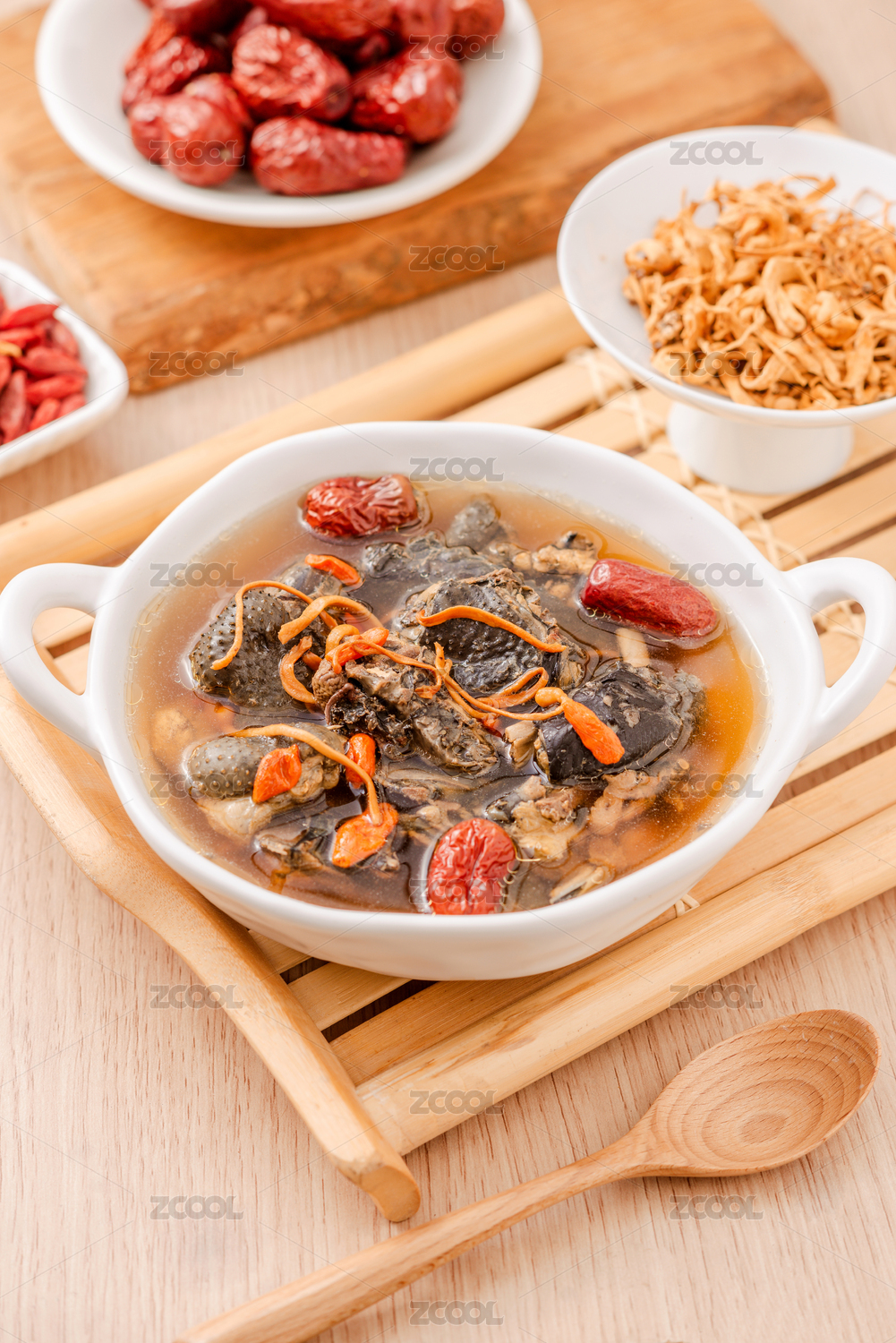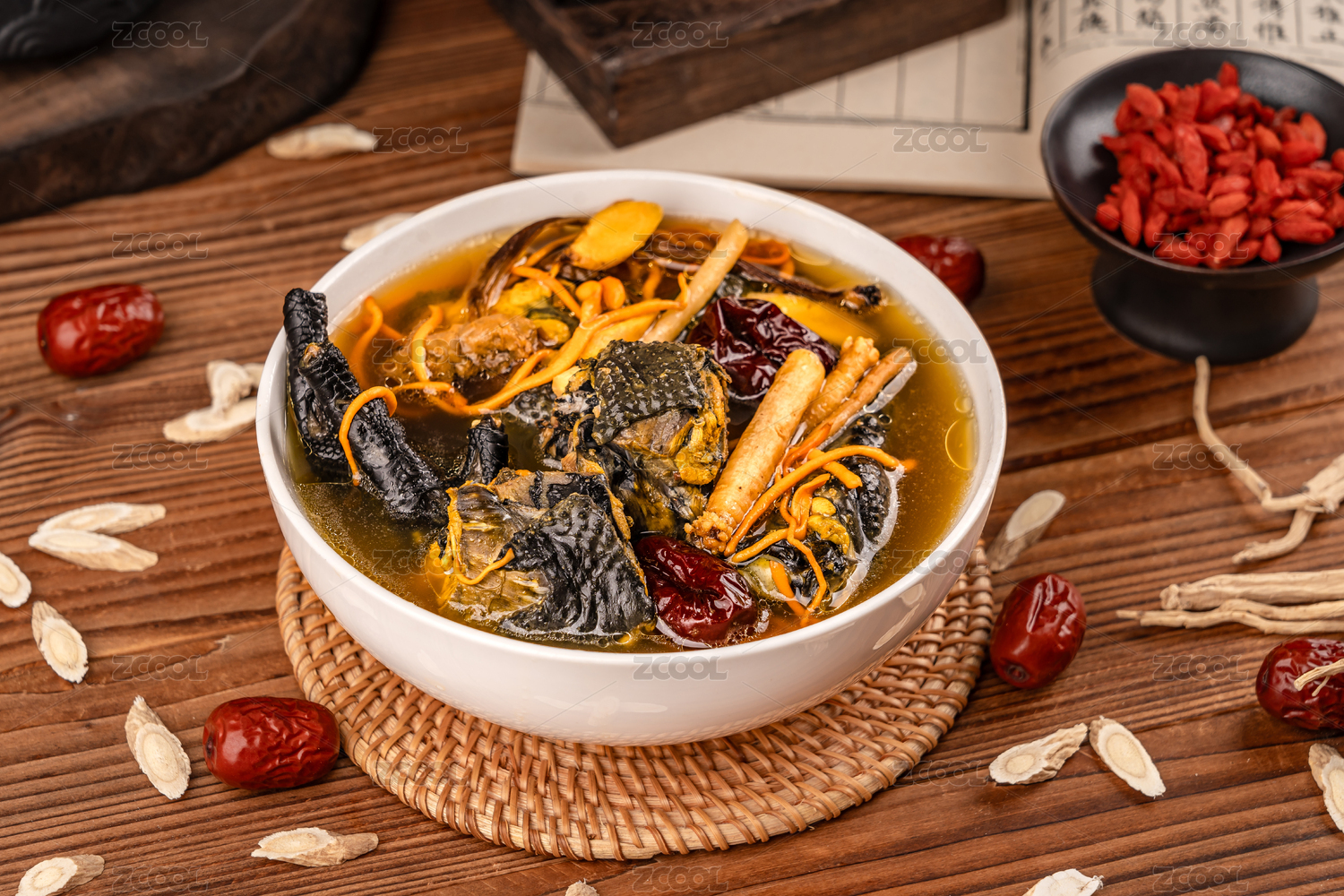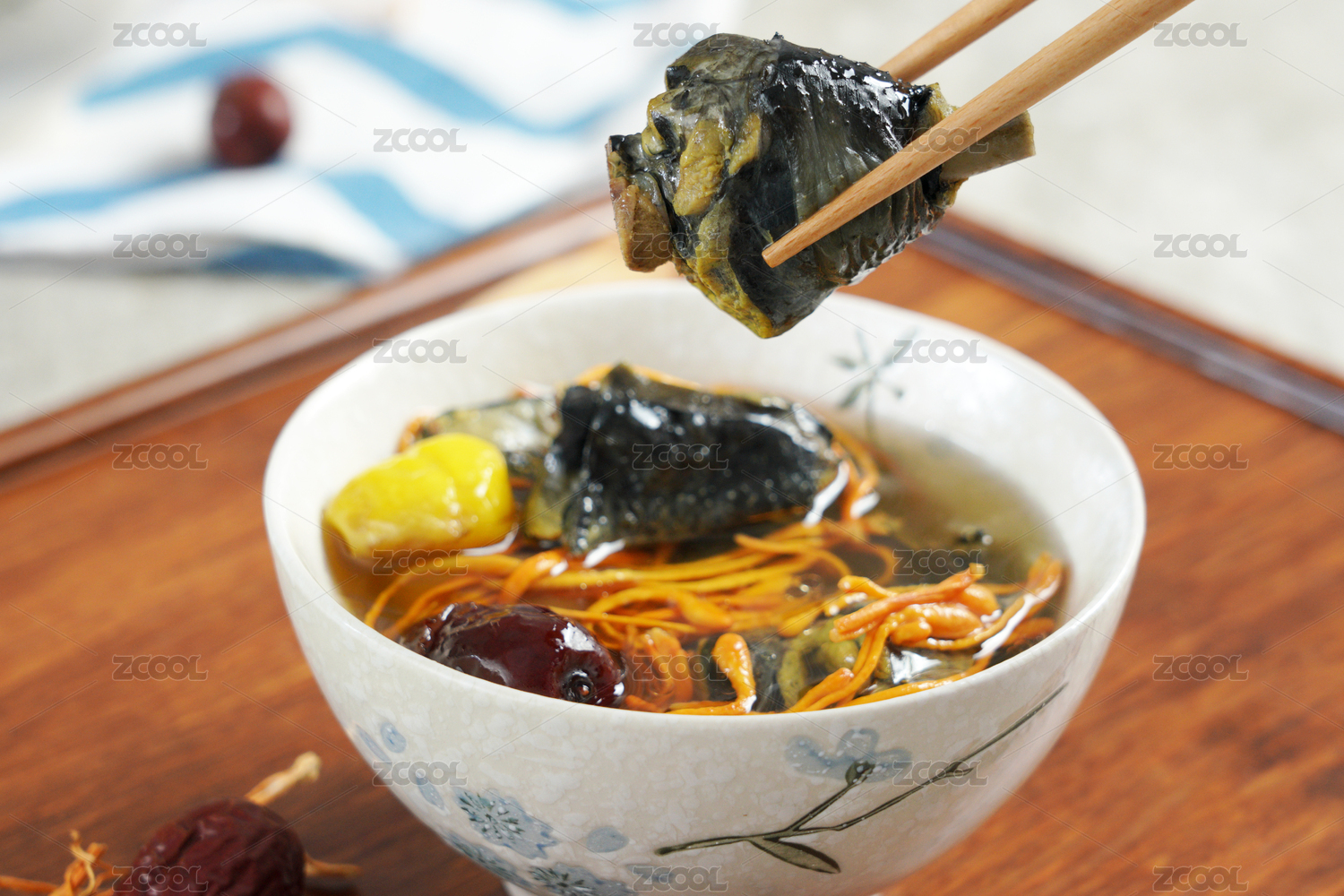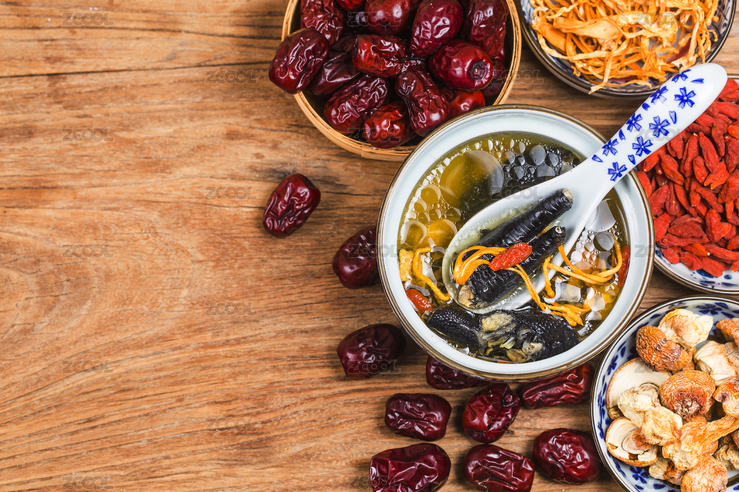 清新原木木桌上湯碗里的紅棗蟲草花烏雞湯