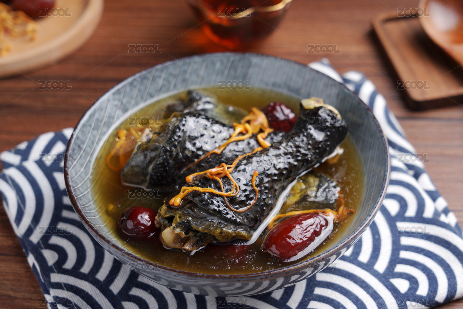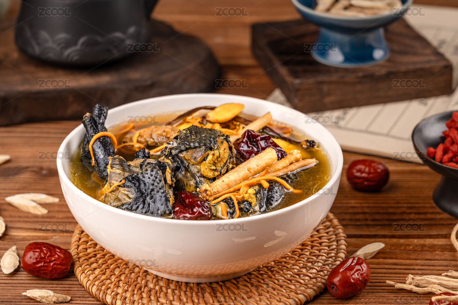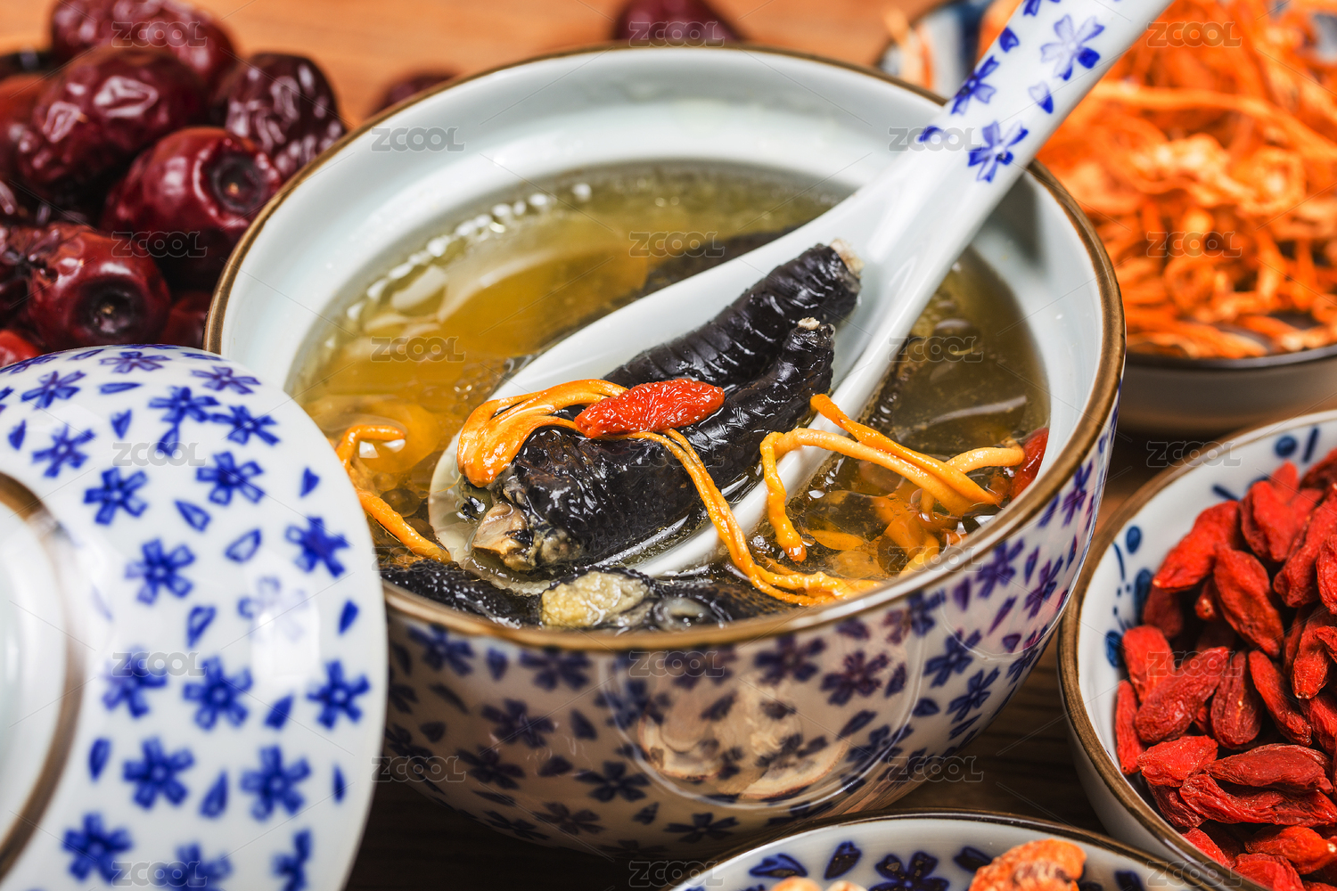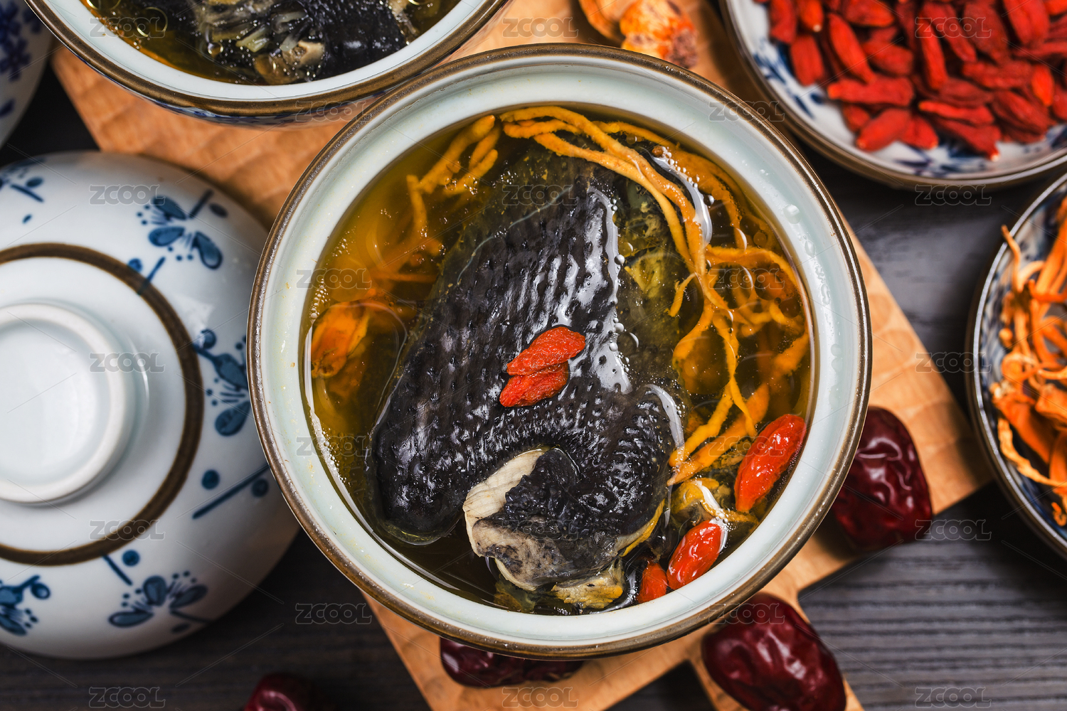 清新原木木桌上湯碗里的紅棗蟲草花烏雞湯