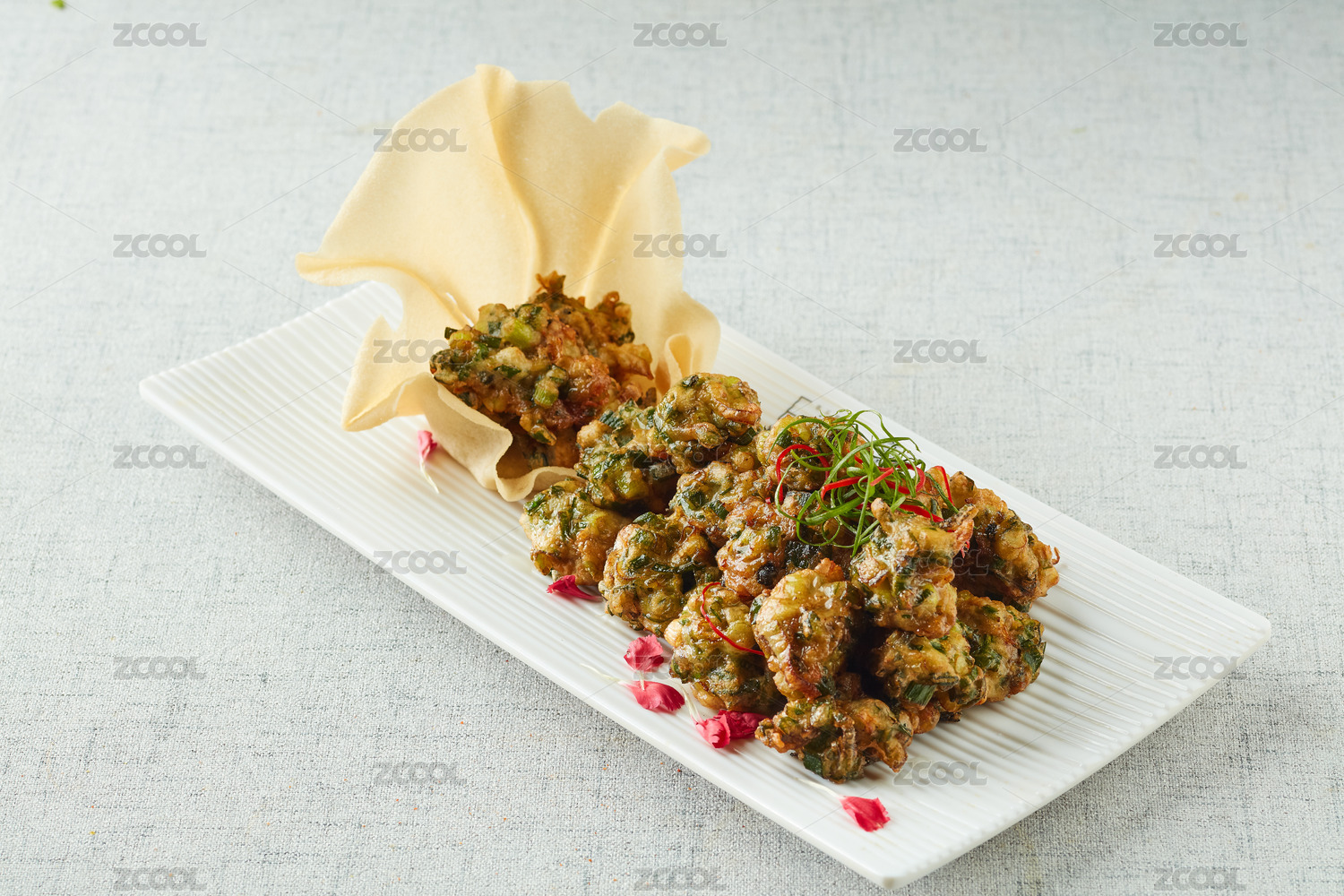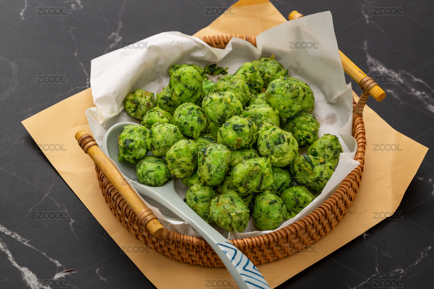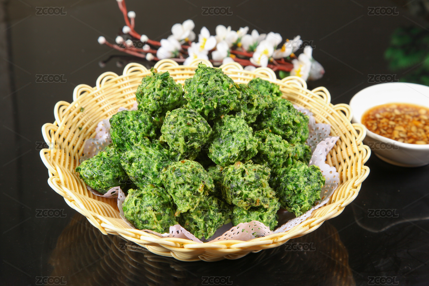 裝在竹編托盤里的韭菜素丸子