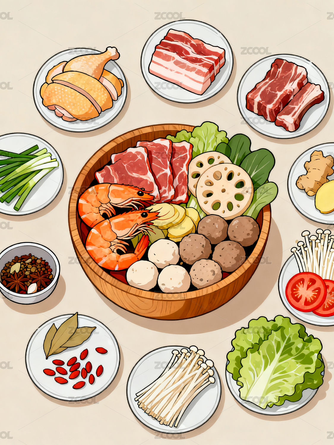 食材火鍋圓形擺放