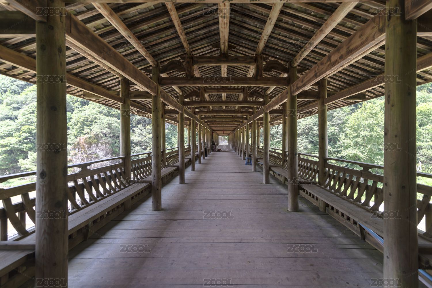 山谷間一木質(zhì)廊橋的內(nèi)部結(jié)構(gòu),中國福建寧德
