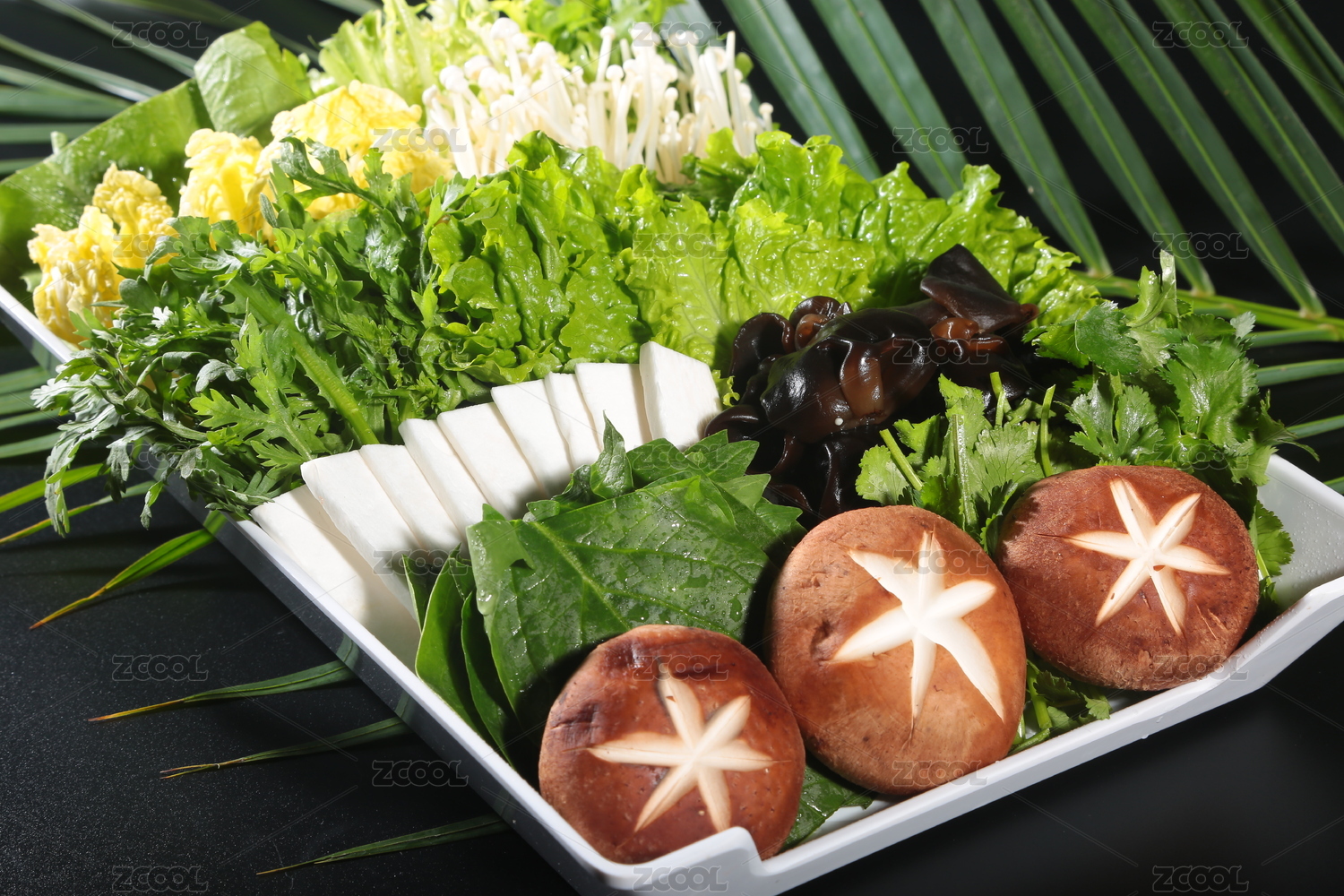 木桌上的白盤里的重慶火鍋菜品時蔬拼盤