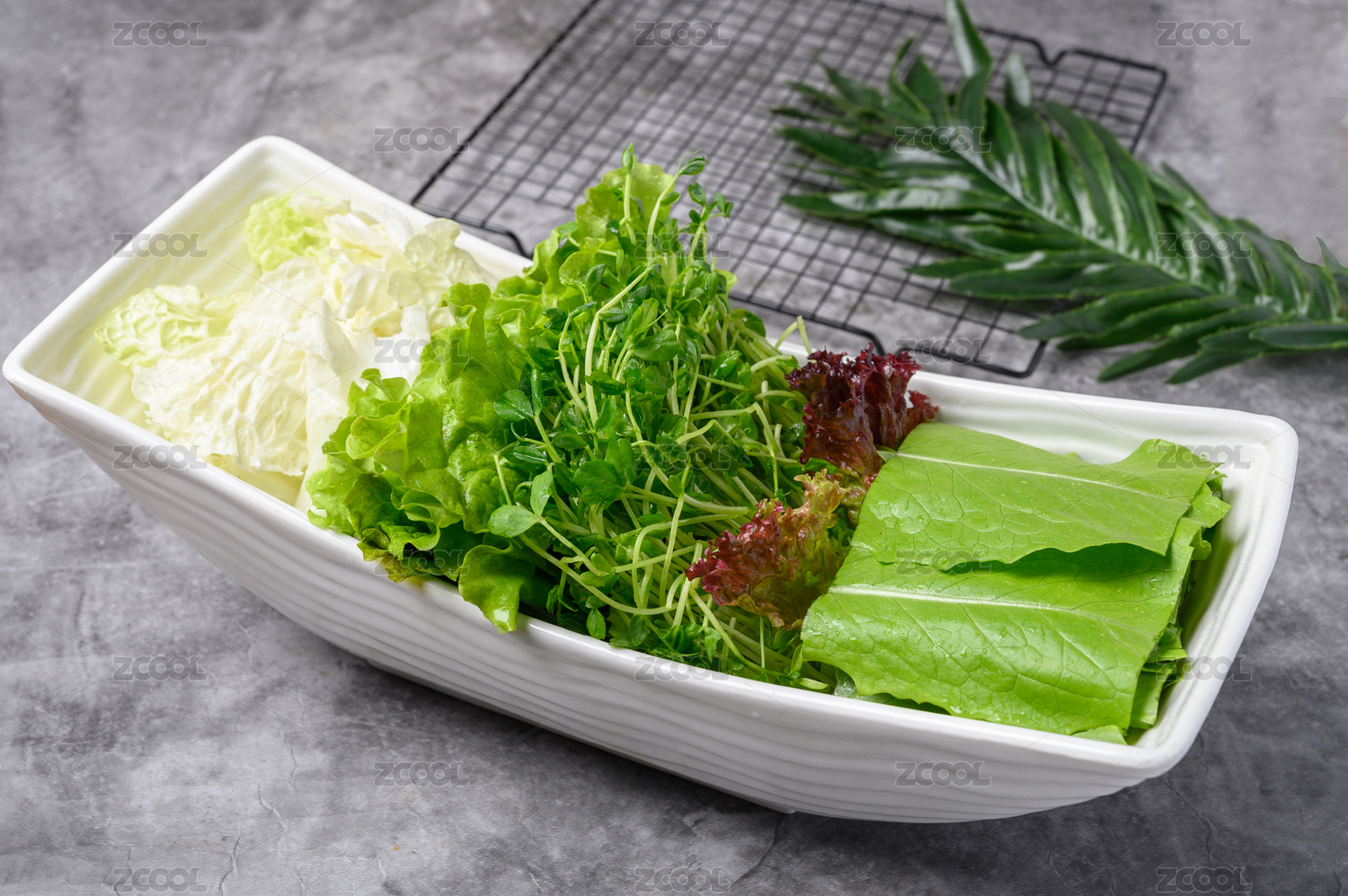 籃子里的火鍋菜品豌豆尖茼蒿白菜生菜拼盤