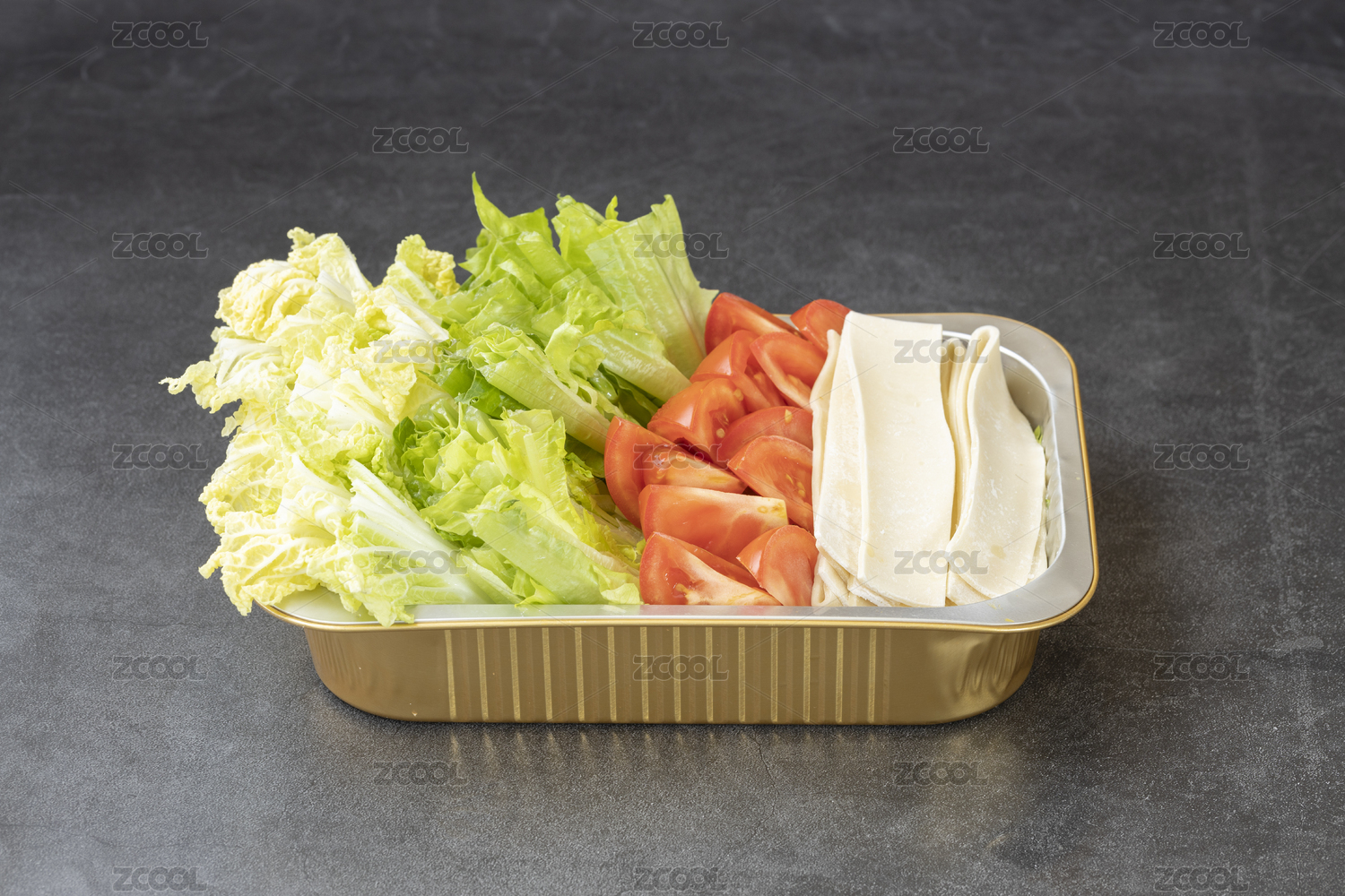 錫箔盒子里的海鮮湯鍋火鍋食材菜品蔬菜拼盤