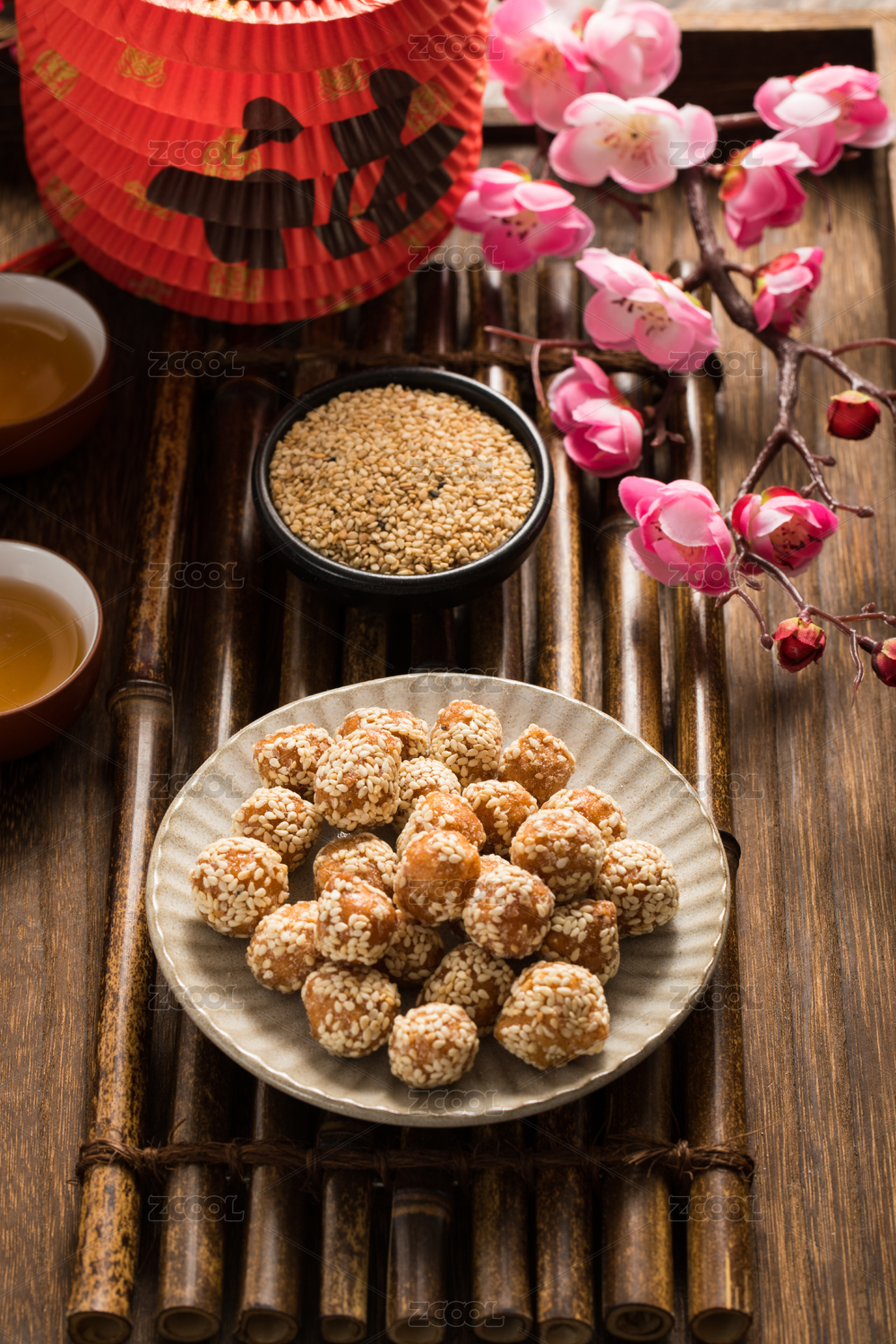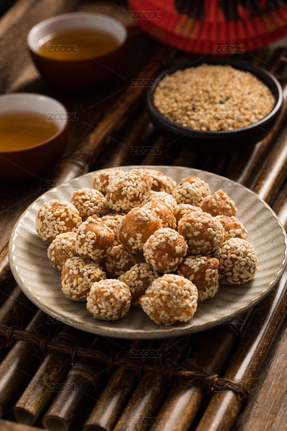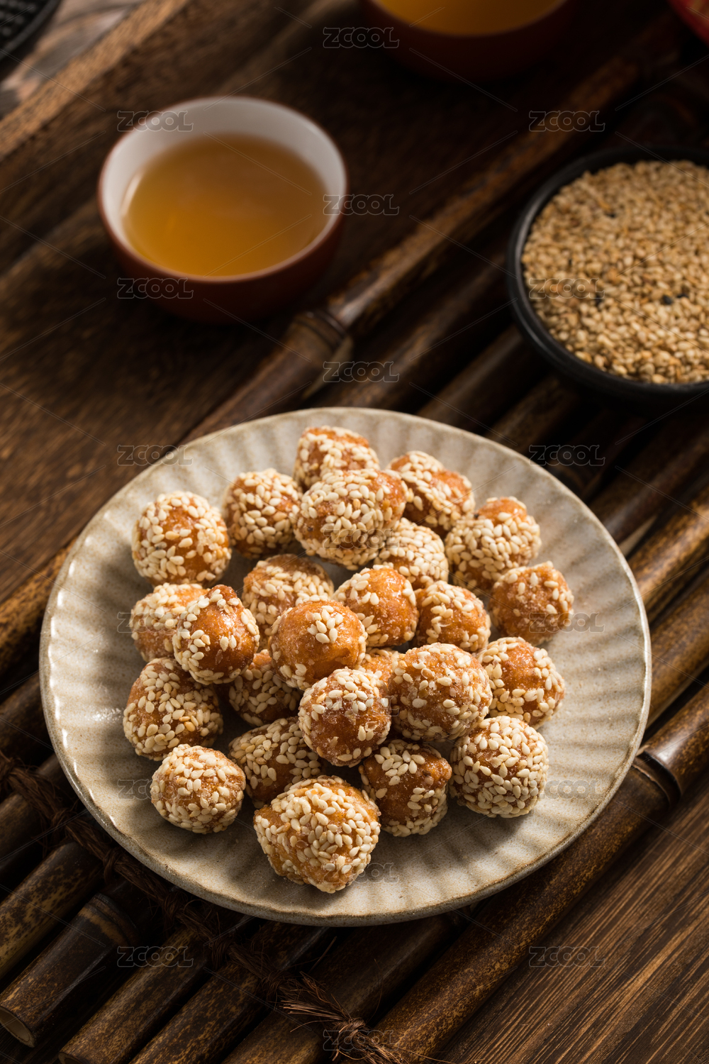 裝在盤子中的傳統(tǒng)中式特色點(diǎn)心白芝麻球