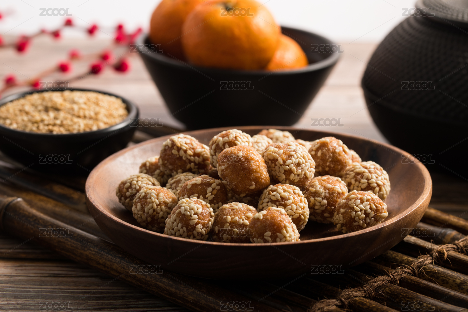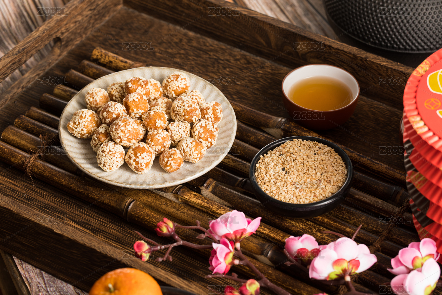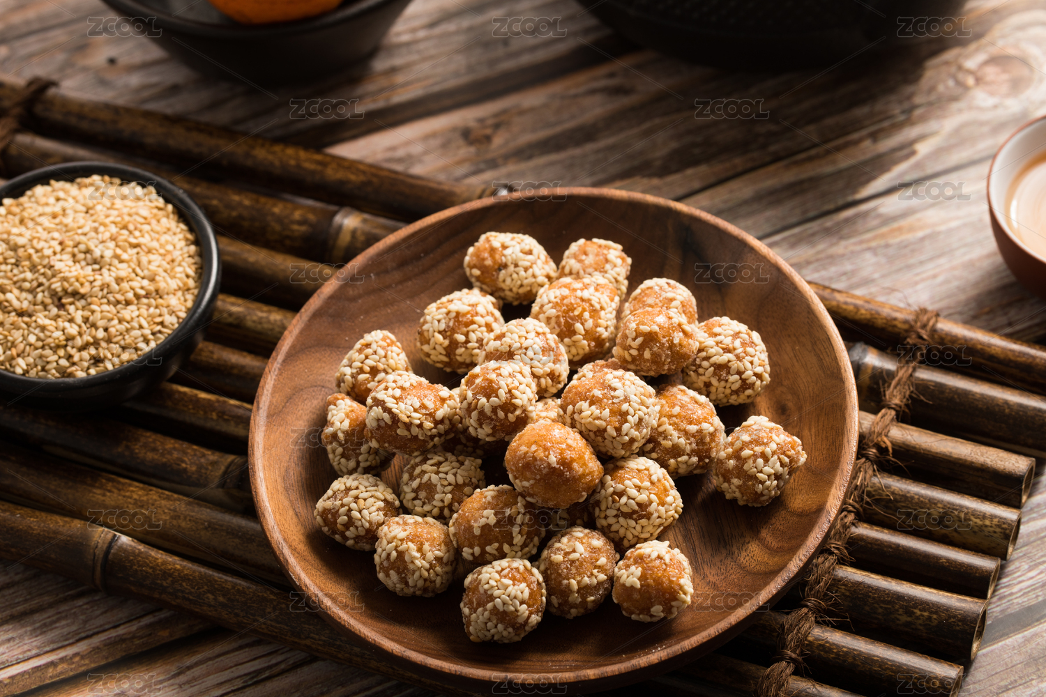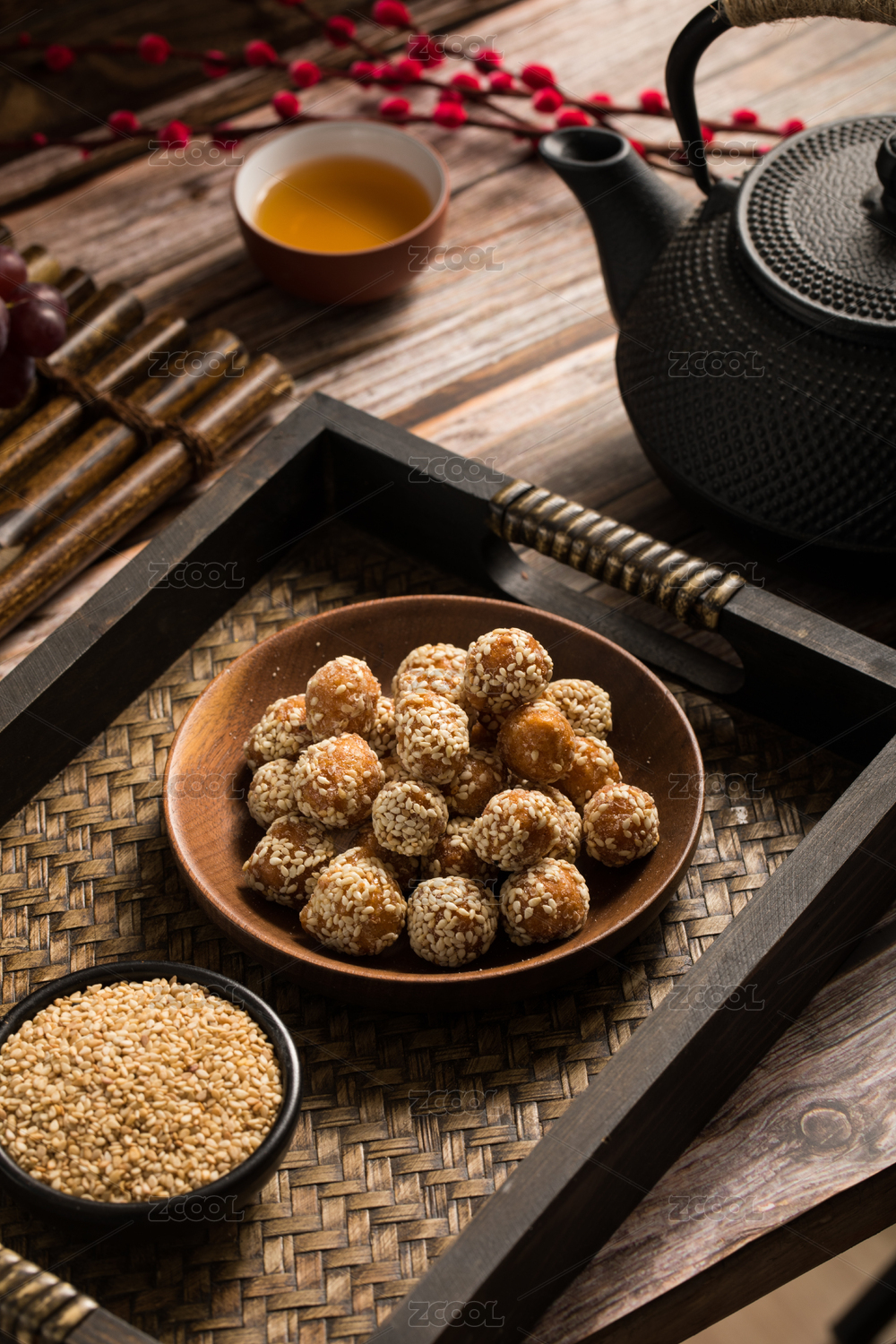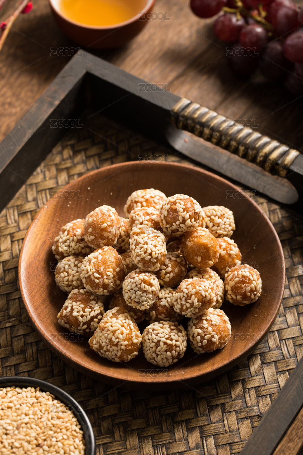 傳統(tǒng)中式背景下裝在木盤中點(diǎn)心白芝麻球