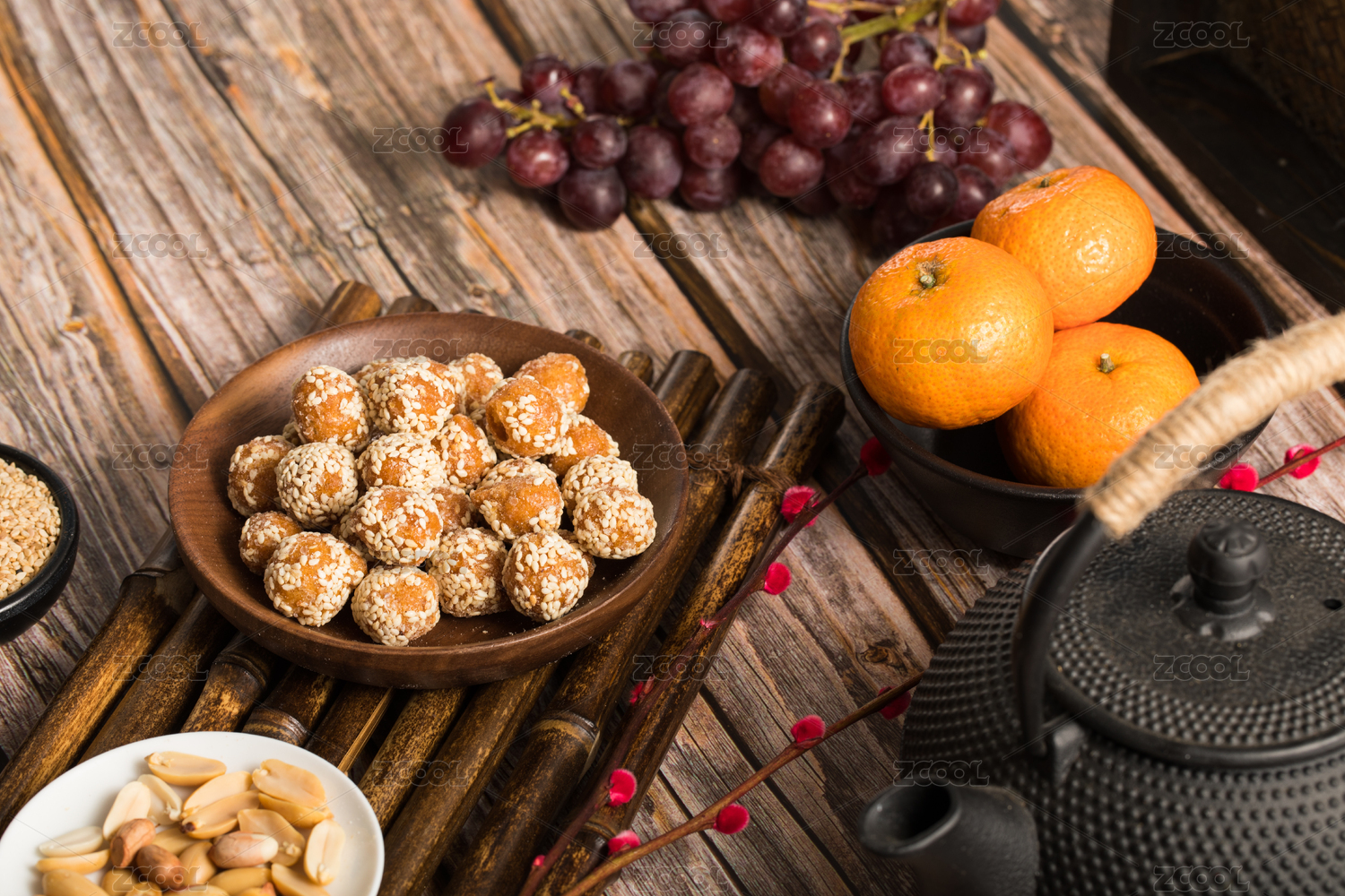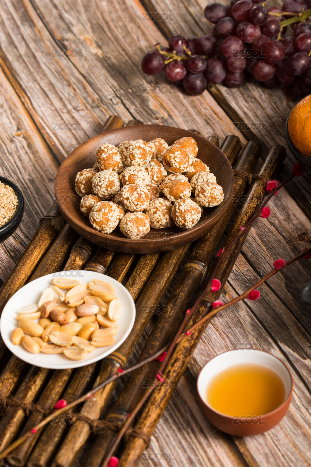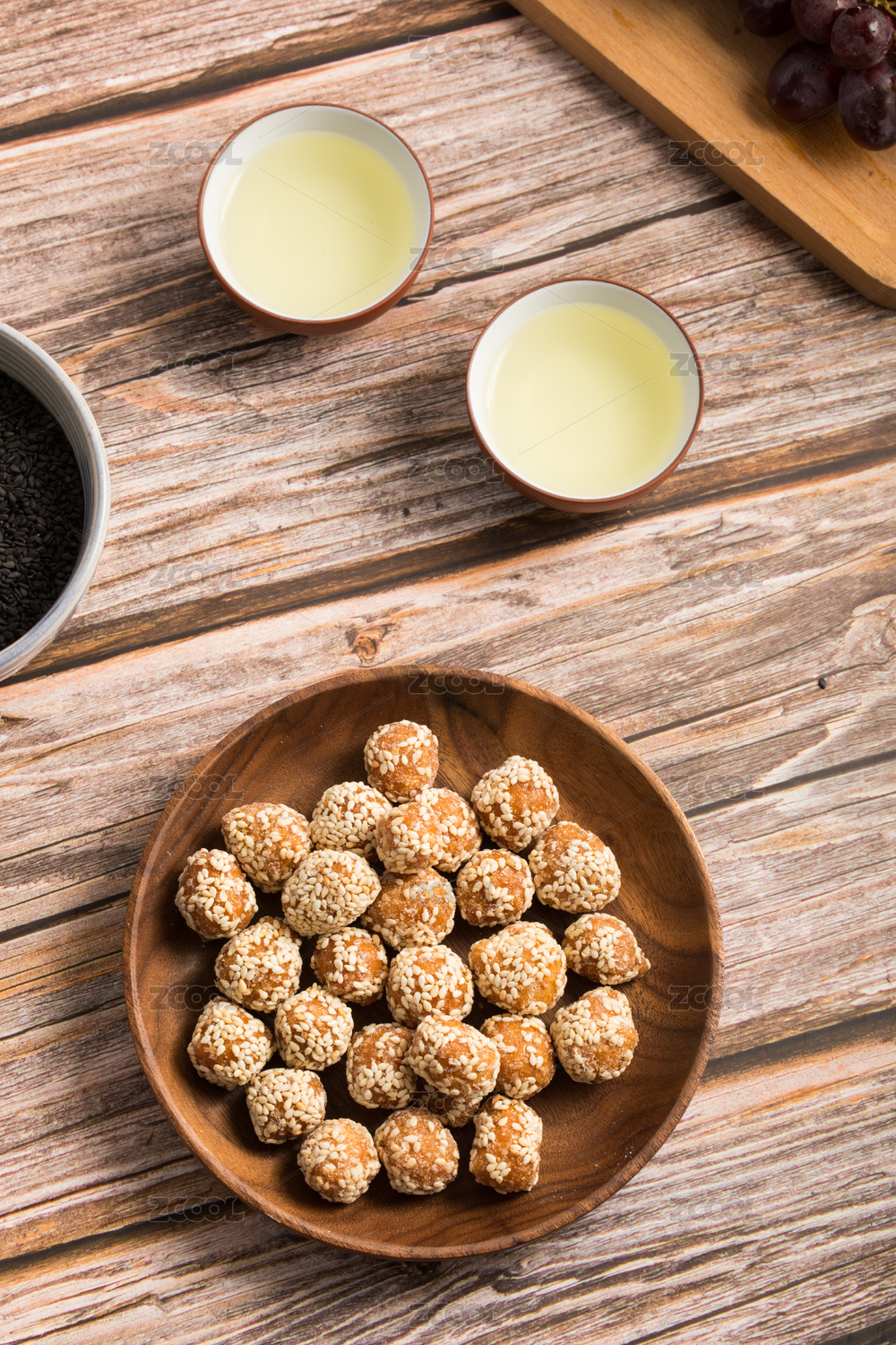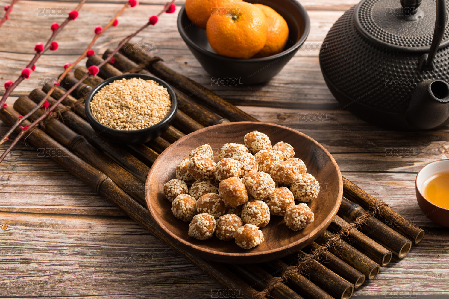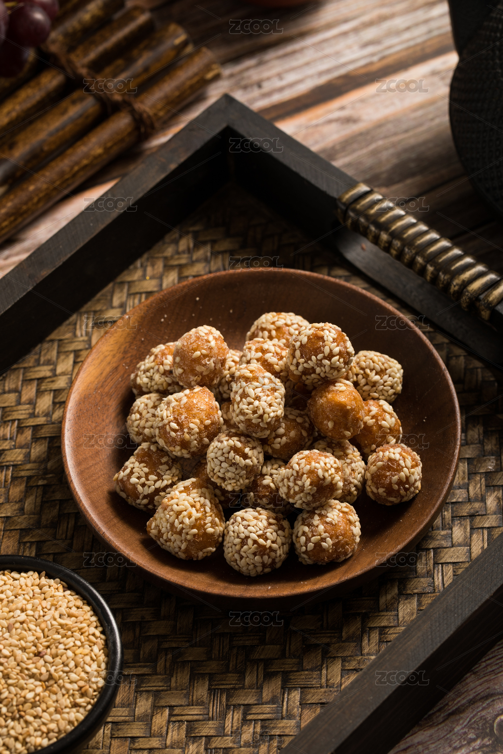 傳統(tǒng)中式背景下裝在木盤中點(diǎn)心白芝麻球