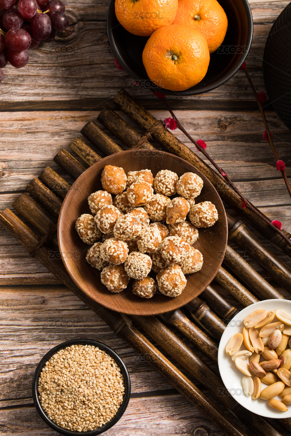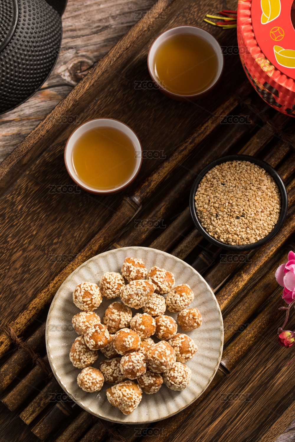 傳統(tǒng)中式背景下裝在木盤中點(diǎn)心白芝麻球俯拍