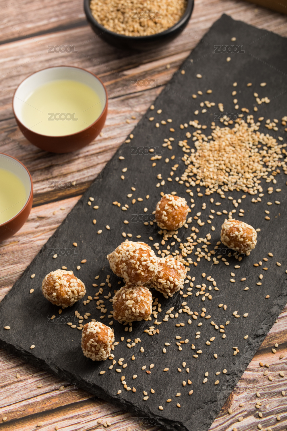 黑色石板上的傳統(tǒng)中式特色點(diǎn)心白芝麻球