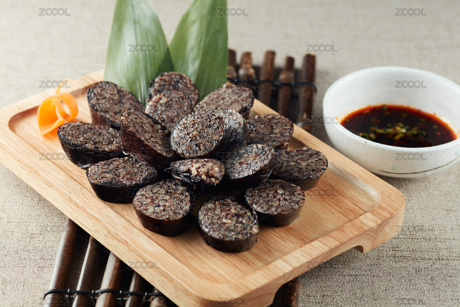 中式復(fù)古場景中切成段放在黑盤子上的血灌腸