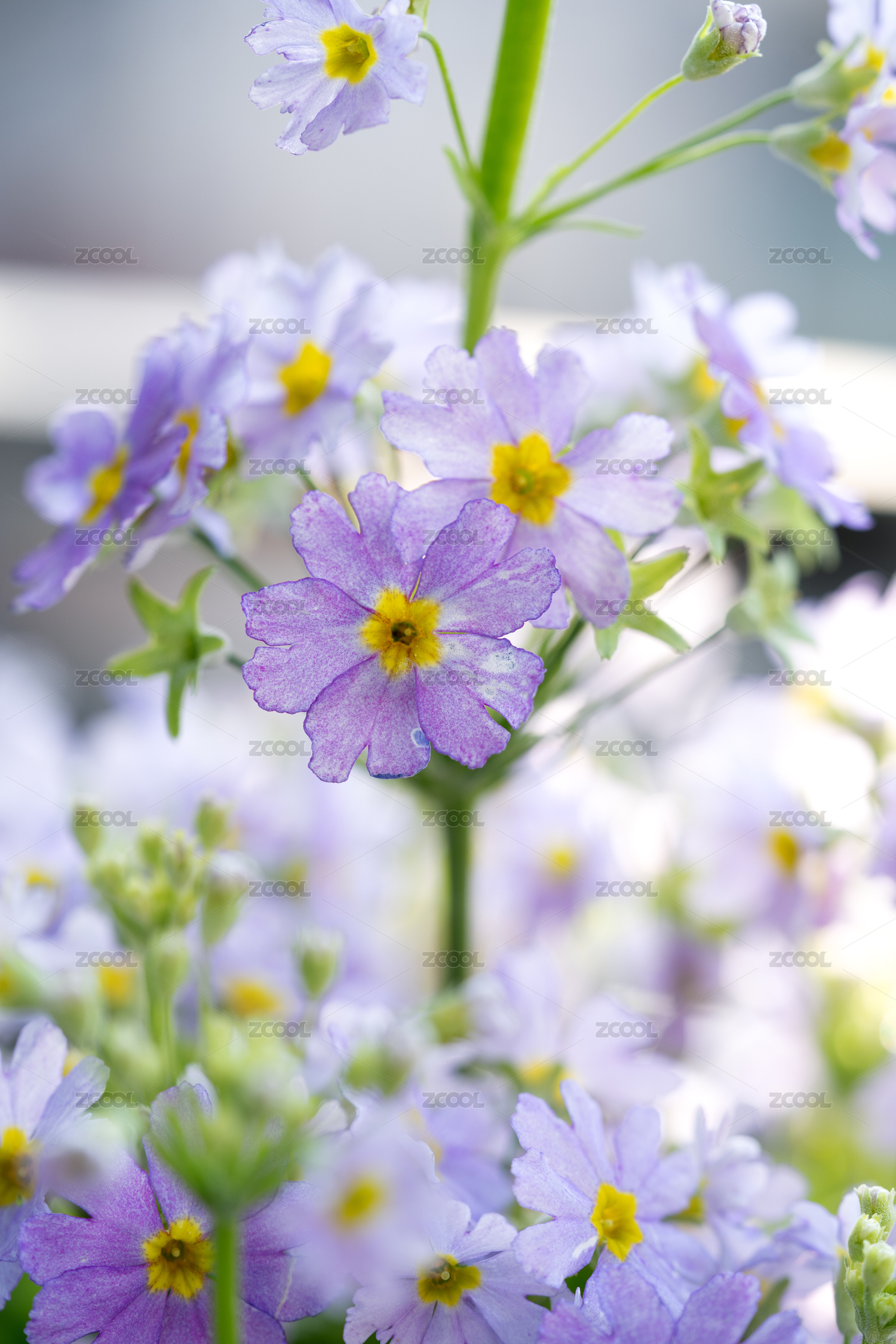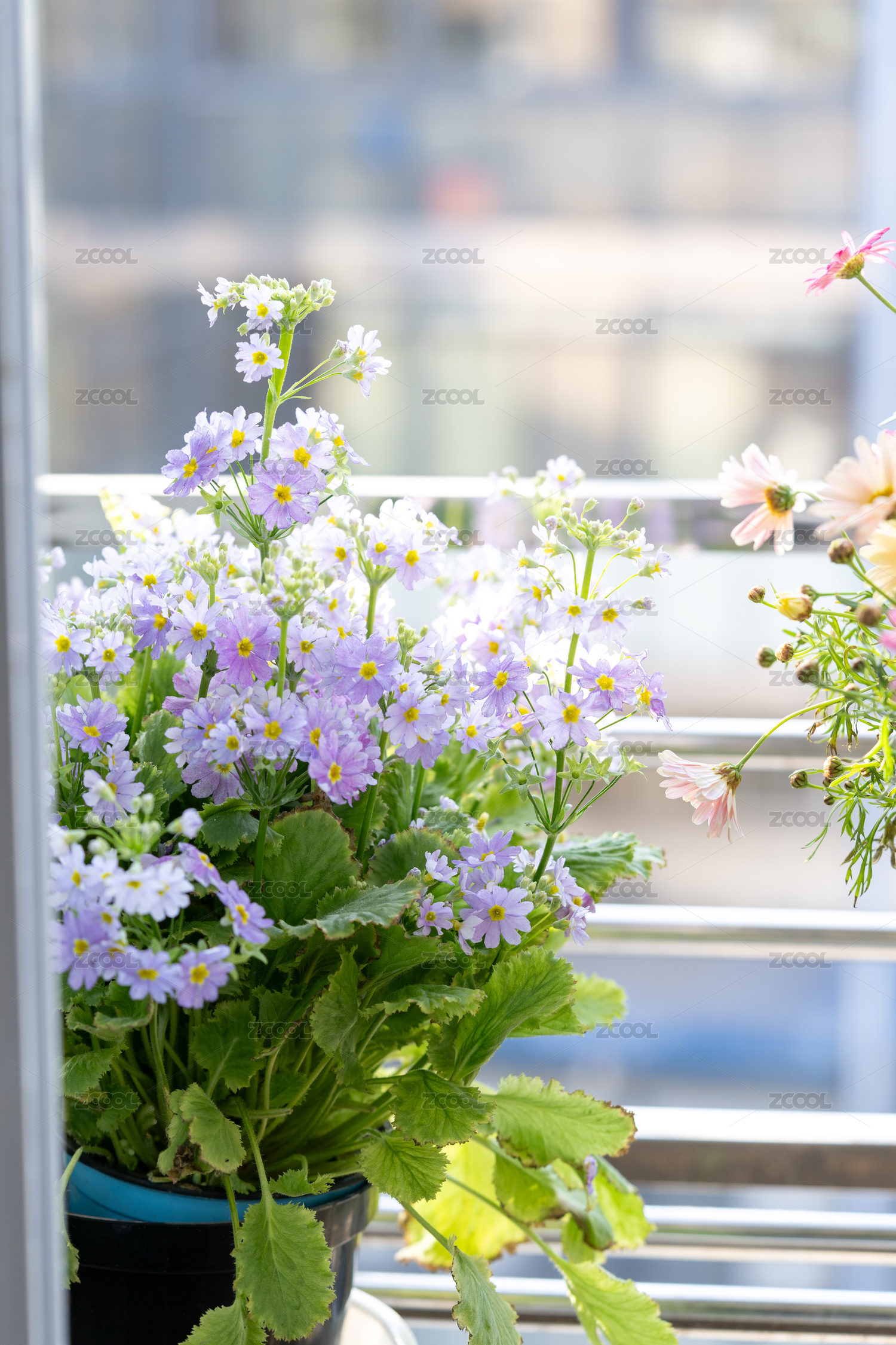 窗臺盆栽淺紫色花近景