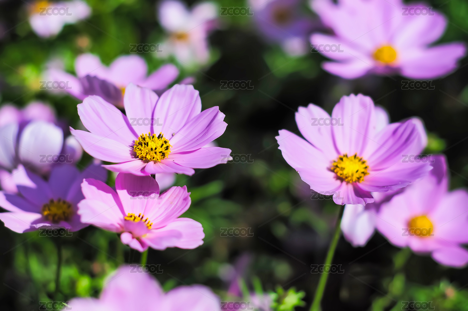 陽光下盛開的淺紫色波斯菊花朵